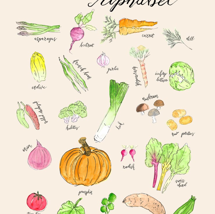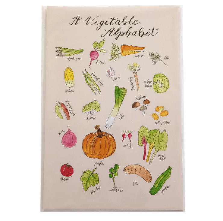 A tasty way of learning your ABC's, this A4-sized art print features 23 loose, watercolour veggies with pen detailing and hand-written name labels. Ideal as a kitchen print, to brighten a child's room or bring a bit of fun to your living space.