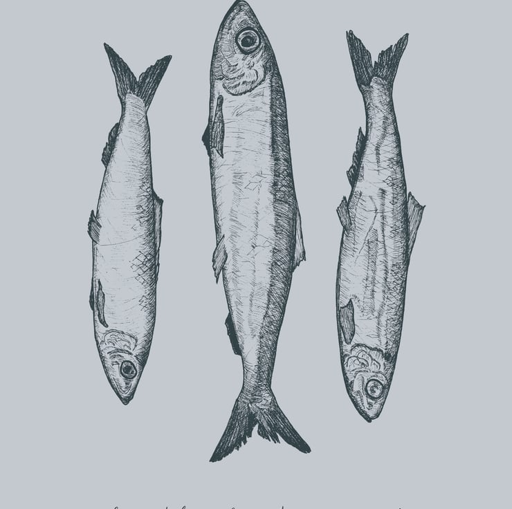 The herring illustrations were hand-drawn in pen-and-ink with two lines from the song hand-written in a modern calligraphy style. The text reads: 'Thou shalt have a fishy... when the boat comes in'