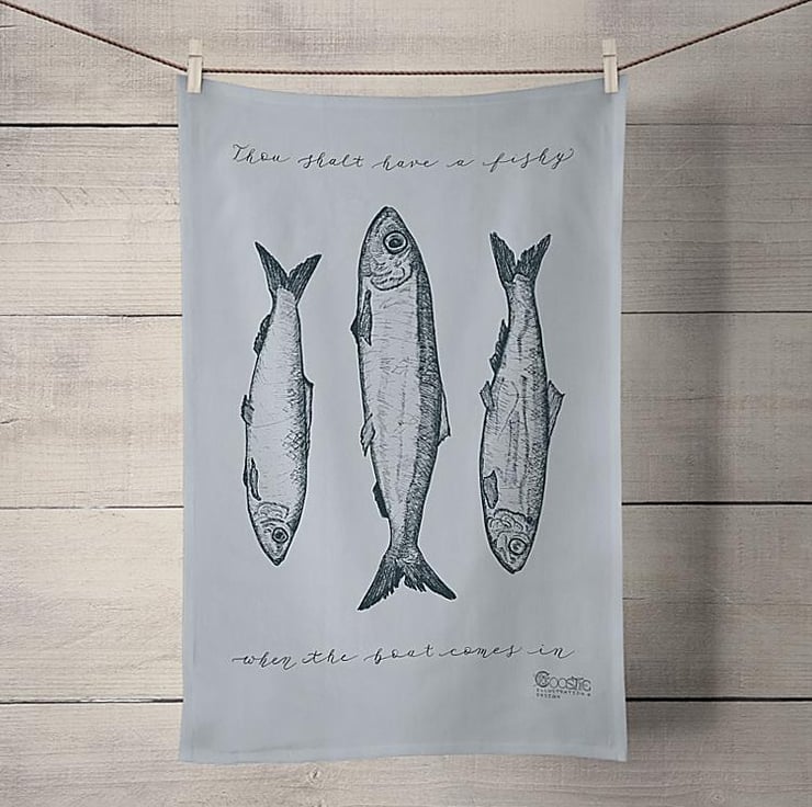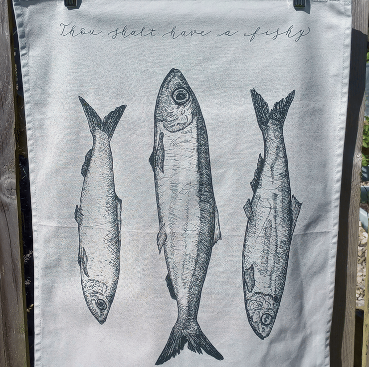 The perfect addition to any kitchen, this eco-friendly tea towel is a lovely, subtle shade of blue/grey, with the herring illustration and song lyrics in dark grey. Made from 100% unbleached, organic cotton and printed and finished here in the UK. Plastic-free packaging.