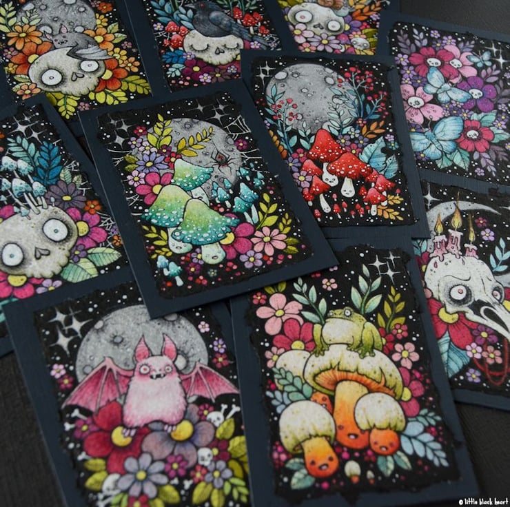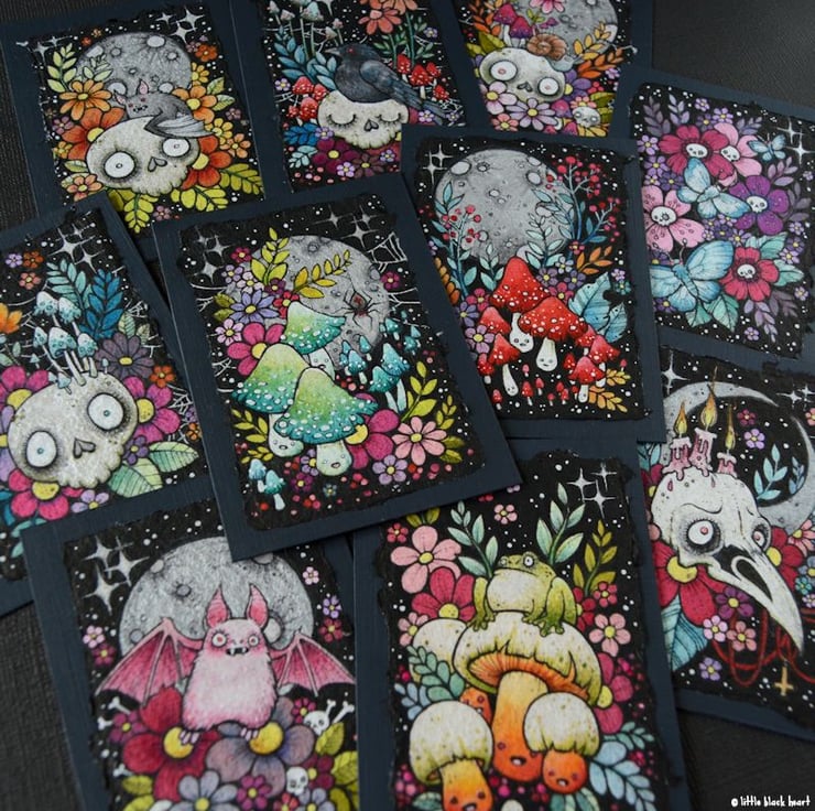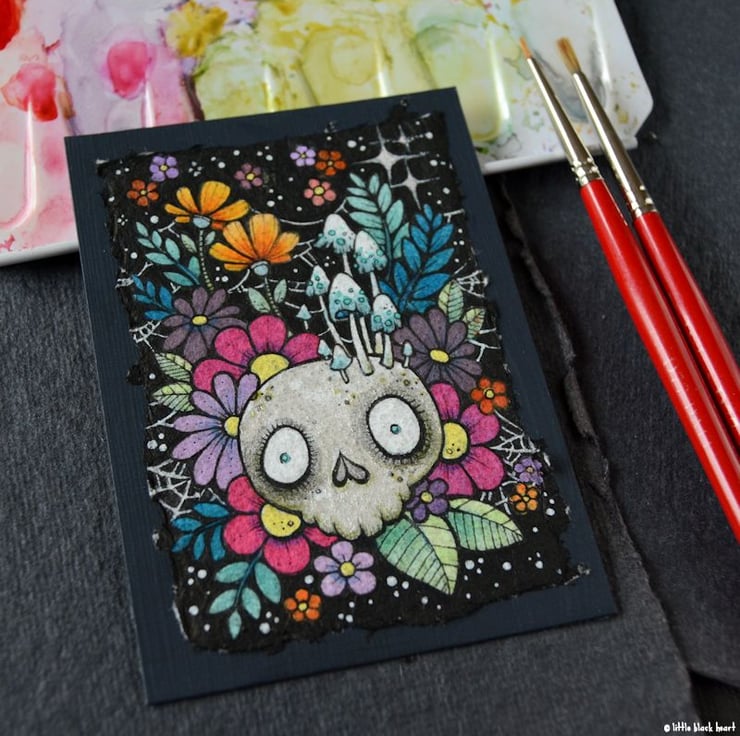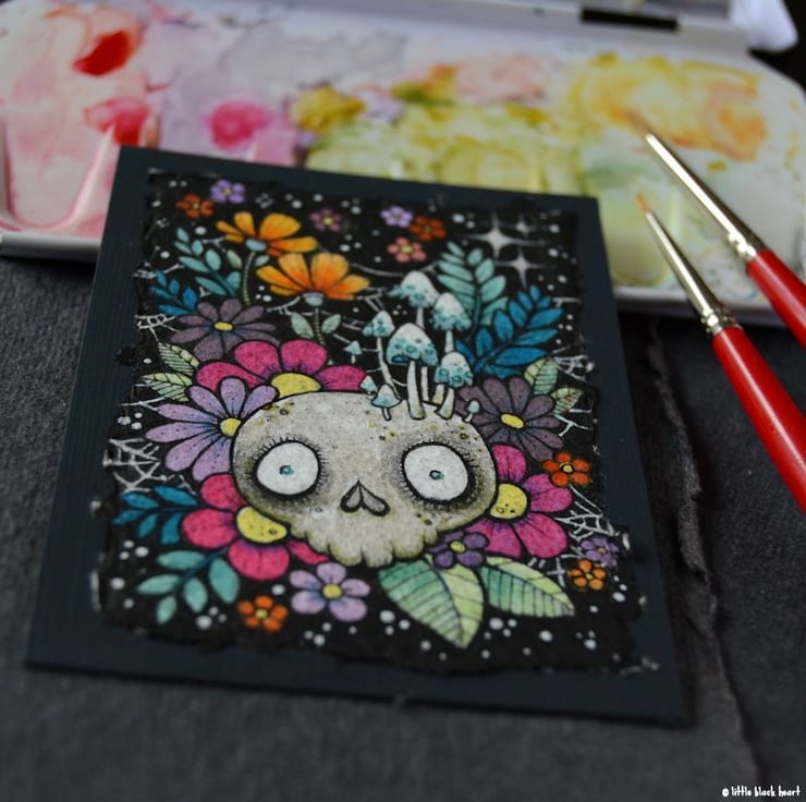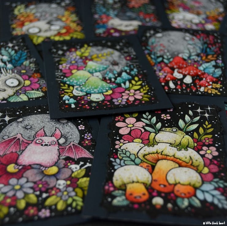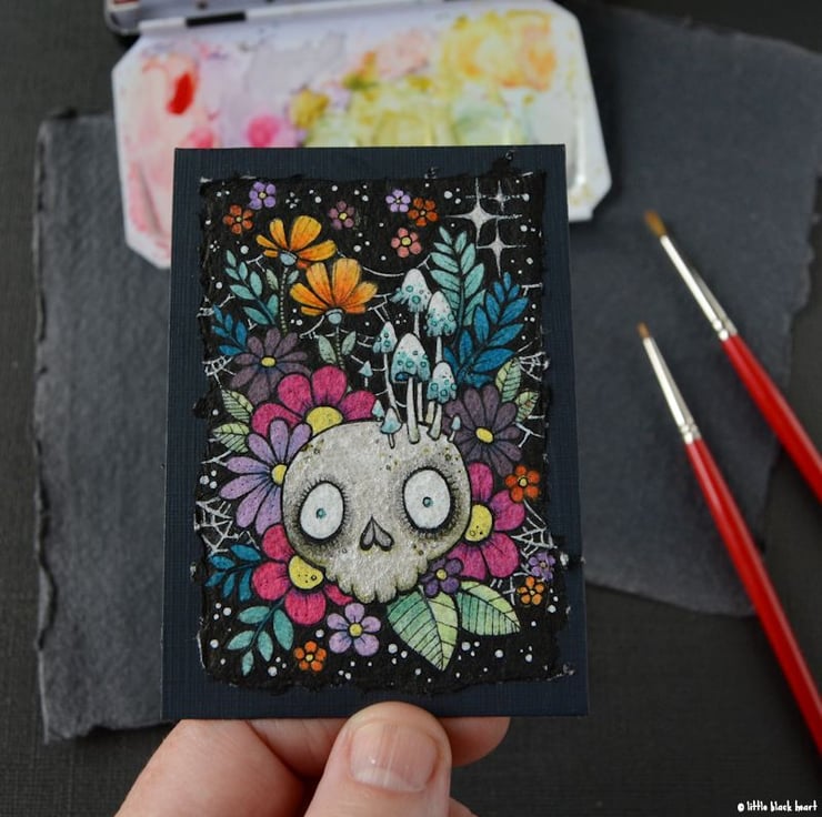 this aceo is an original artwork, hand drawn with a tiny 0.05 nibbed pen, then coloured with ink, artists pens and watercolour paints, on indian khadi paper. khadi paper is handmade from recycled cotton rag, it has a lovely textured surface and deckled edges. i have then mounted the illustration onto 300gsm cardstock, hand painted with a paynes grey to create a dark surrounding edge/background.