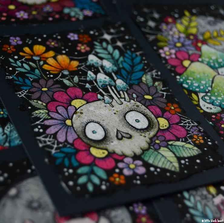 this little illustration features a sweet floral skull and his crown of fungi, surrounded by various blossom and blooms. part of a creepy cute collection of allsorts.