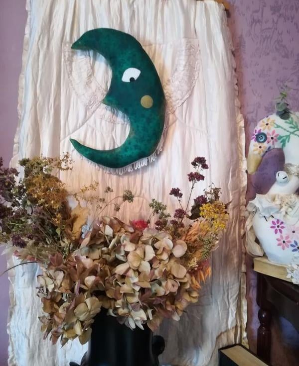 One of my most popular pieces, a textile art moon wall hanging.