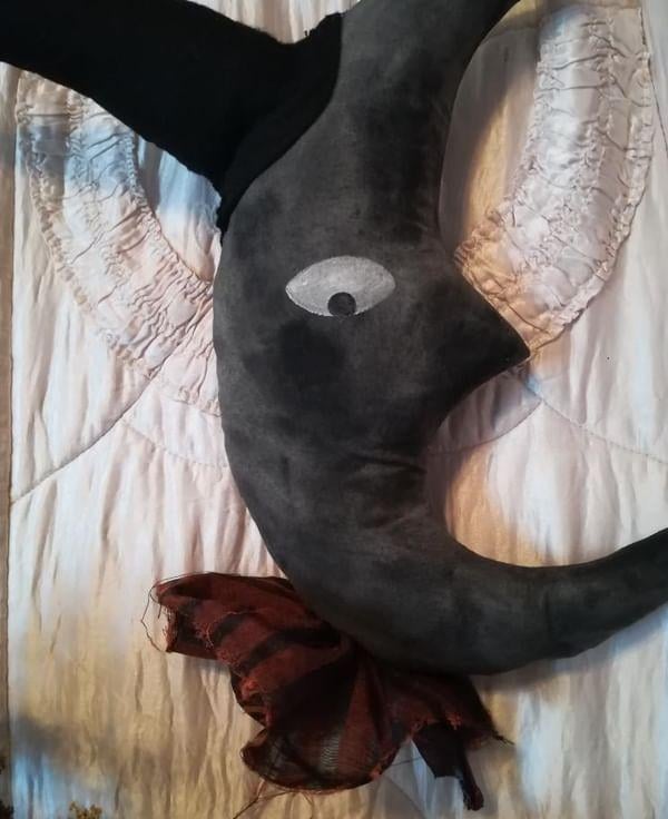 With a hand painted eye detail, a fabric/felt witches hat and vintage fabric ruffle