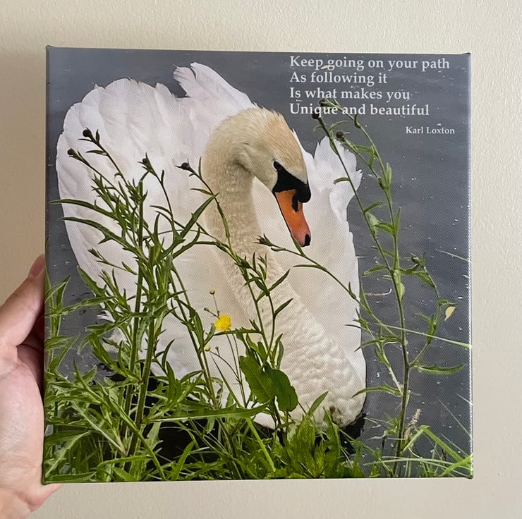 Swans Canvas print, 10 by 10 inches by 2cm deep. "Keep going by Karl Loxton, ready to hang on the wall. I am selling my friend's wonderful work for him, xxx