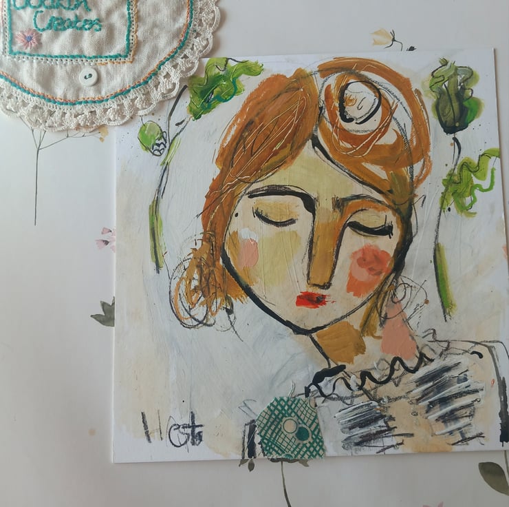 Original not a print. On card, unframed. In my loose signature style my inky girls look great in a white frame. Measuring 24.cm square.