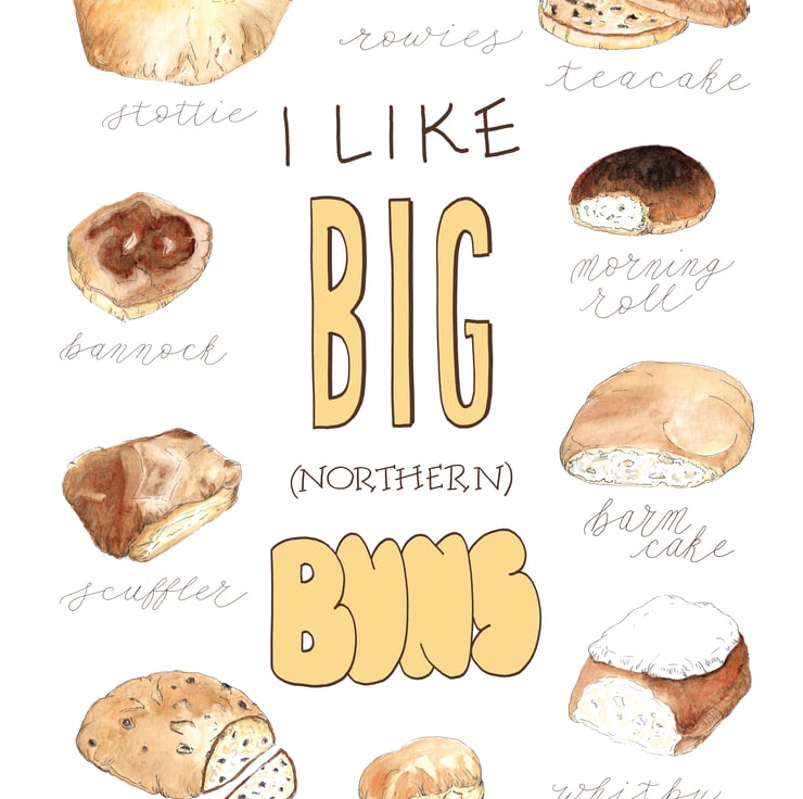 Original watercolour and ink illustrations of a range of Northern buns and baps with hand-written name labels, printed on eco-friendly, high-quality eucalyptus paper here in the UK.