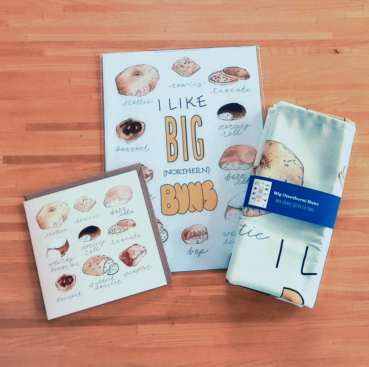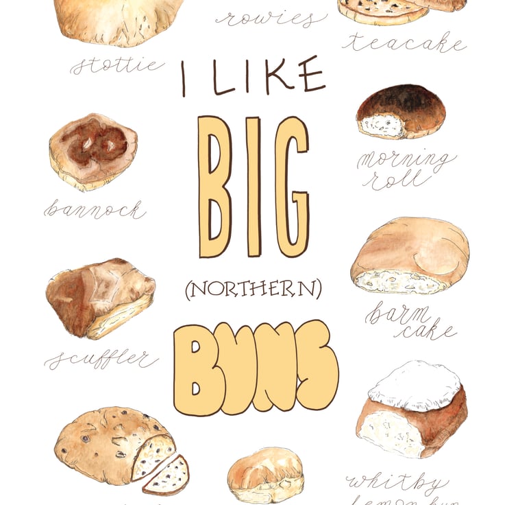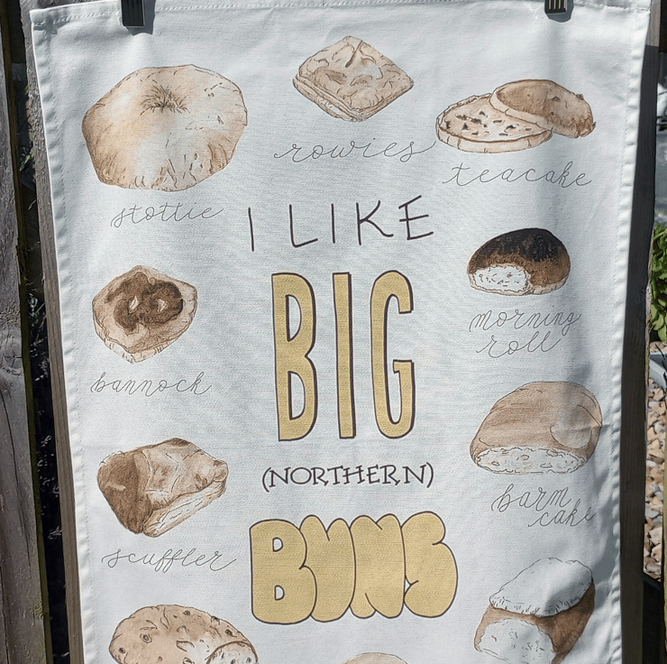 Love a big bun? Celebrate the North of the UK with my Big (Northern) Buns tea towel, inspired by Northern breads, from Geordie stotties to Scottish bannocks! This quirky design also gives a nod to the 1990s anthem by Sir Mix-a-Lot, with a playful twist on the famous line, “I like big butts.”