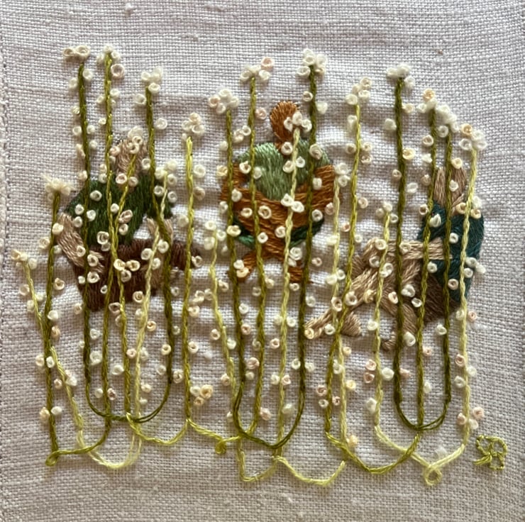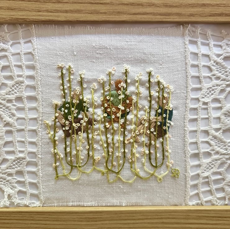 My embroidered art explores the intersection of nature, heritage and culture. I draw inspiration from folklore, the natural world and personal experiences to create works that are both evocative and deeply symbolic. By meticulously hand stitching onto inherited and reclaimed fabrics, I breathe new life into materials steeped in history and memory. My pieces explore themes of the interconnectedness of nature, resilience, and the complexities of the human experience.