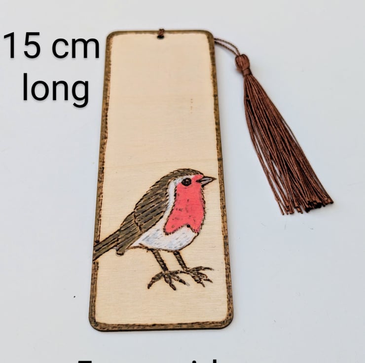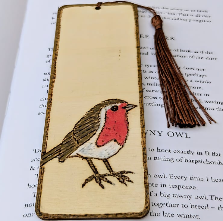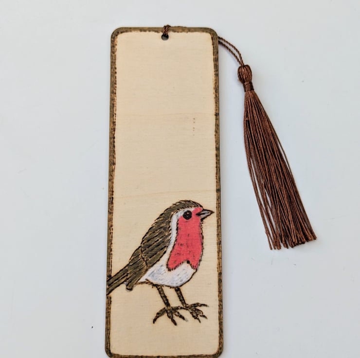 Lovely wooden bookmark which has been handburnt with a pretty robin design using the art of pyrography and then given a pop of colour with acrylic paint. The bookmark has been given several coats of varnish for protection and finished with a brown tassel.