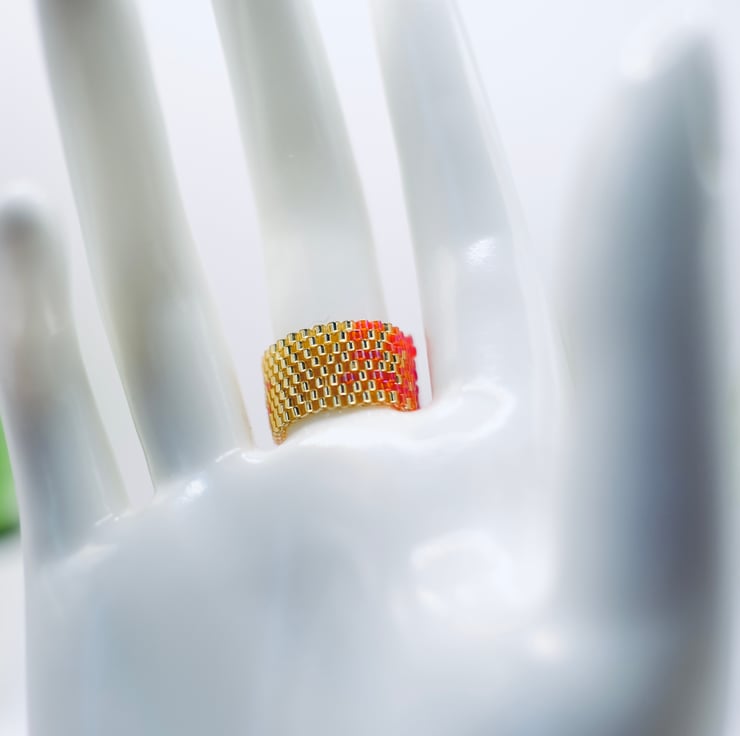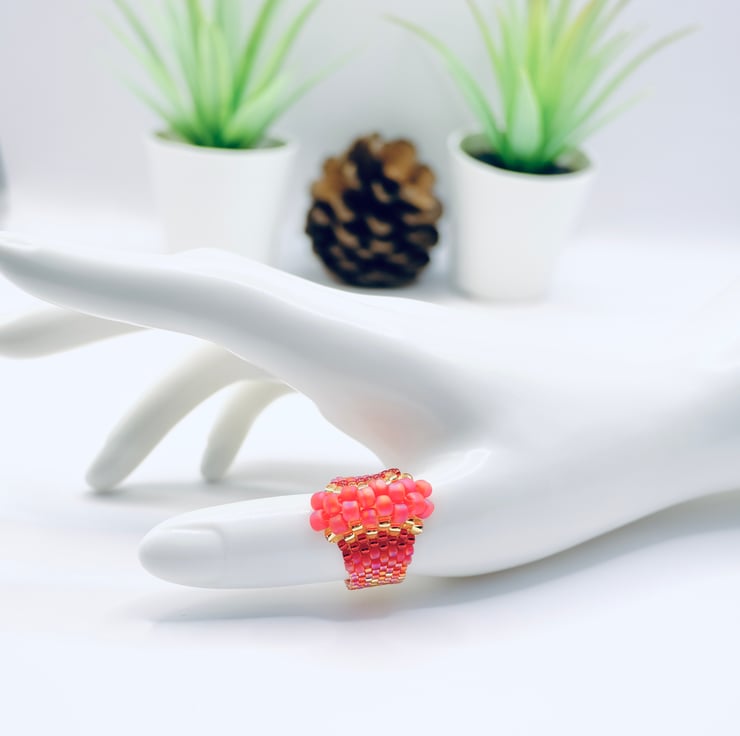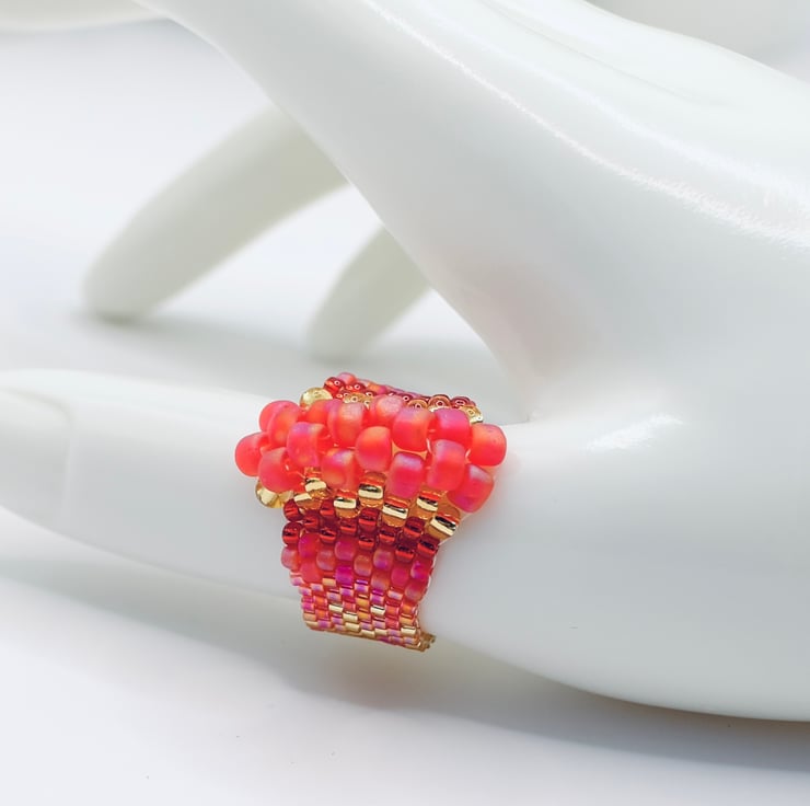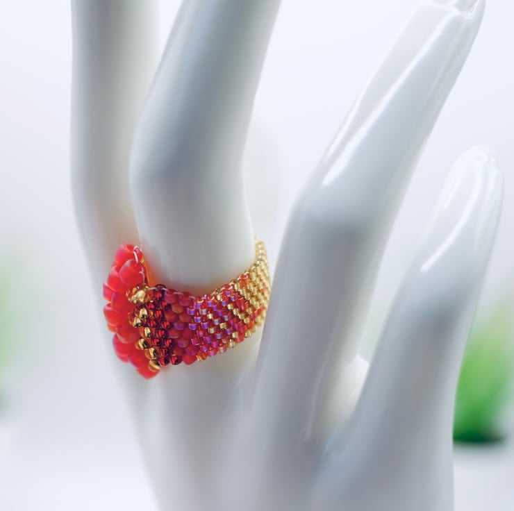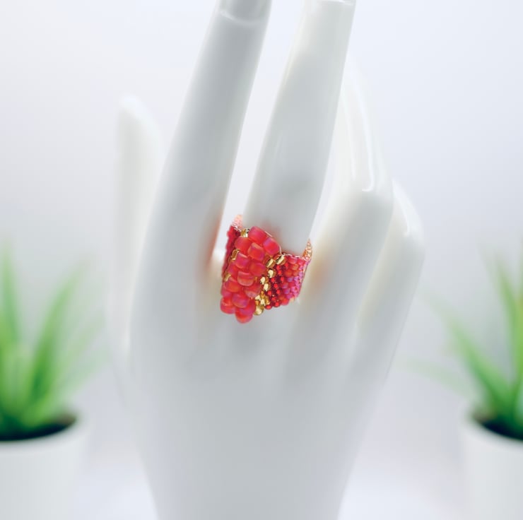 This simple yet classy ring is designed with style in mind. Made of high quality Japanese Delica and Toho beads in bright, sparkling pinks, reds, and shiny gold, this beautiful ring will brighten hands and jewellery boxes for years to come.