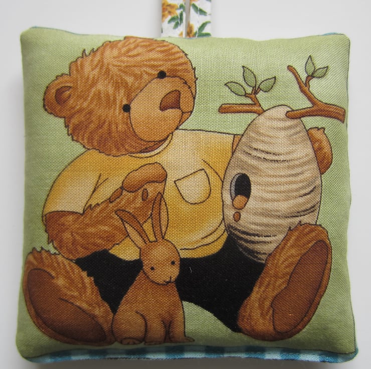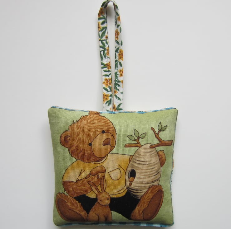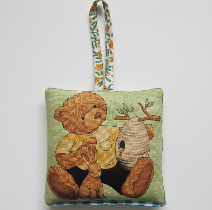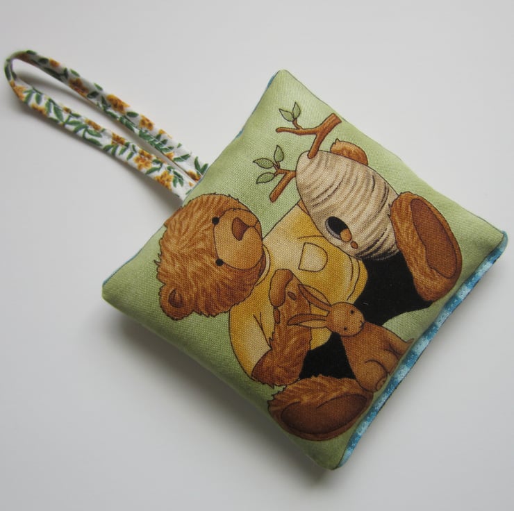 Lavender bag or sachet made with a bear and bunny rabbit fabric. It is backed with a floral fabric in yellow, green and white and the hanging loop is in the same fabric.