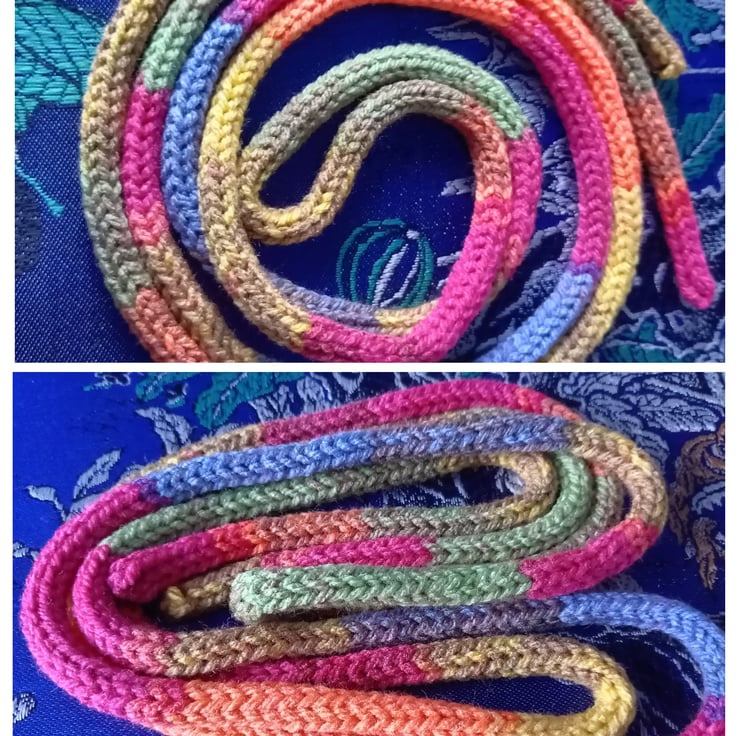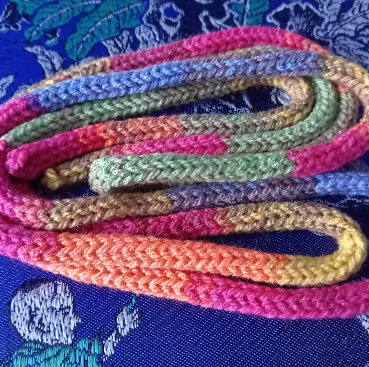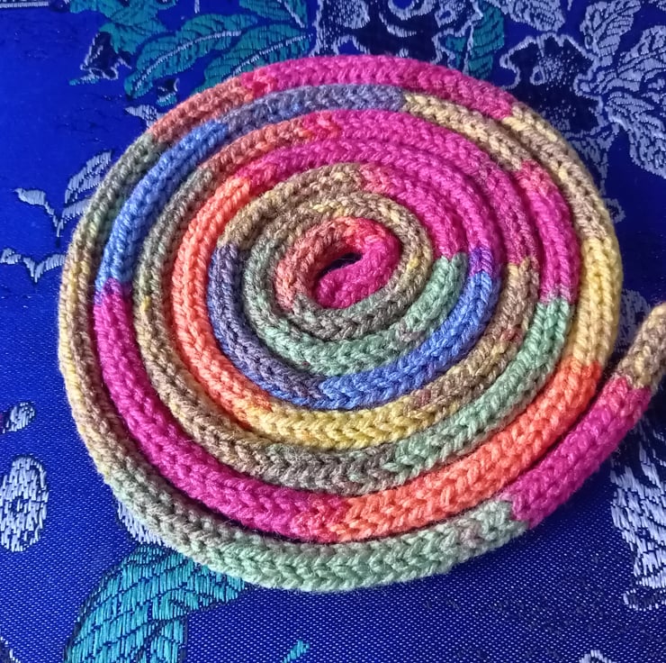 This is a hand crafted knitted cord using a multi coloured acrylic yarn.