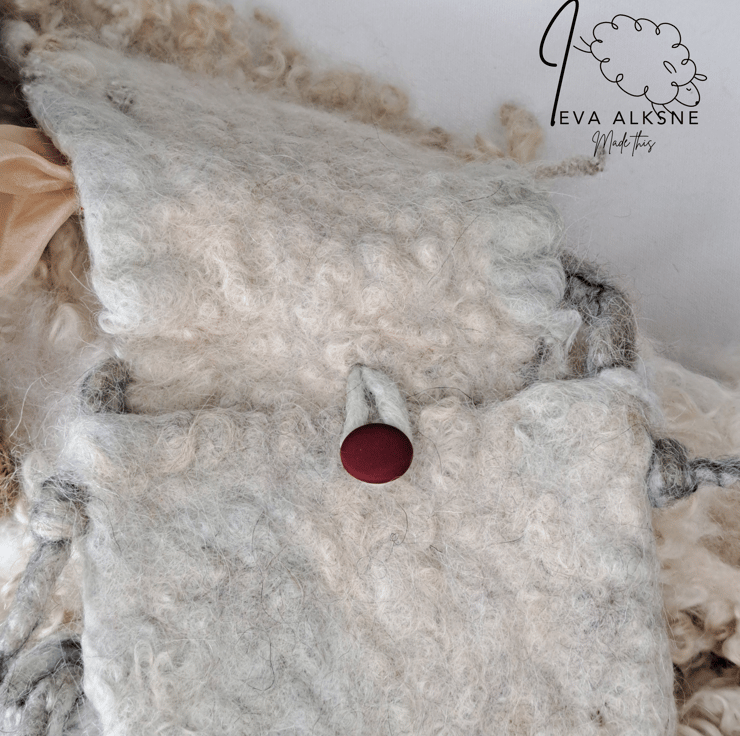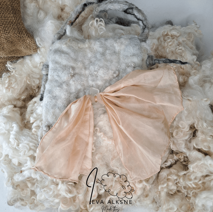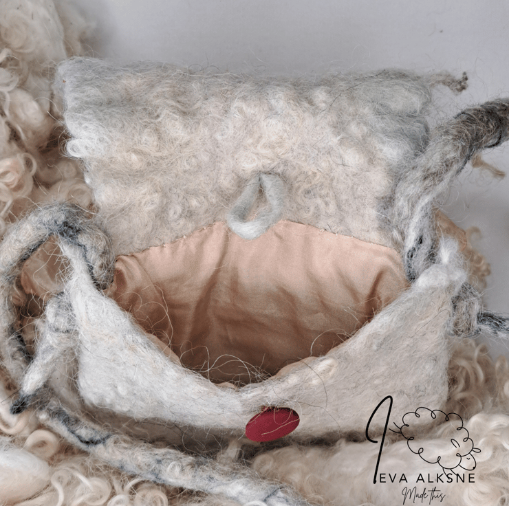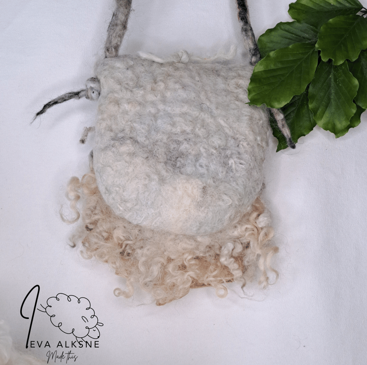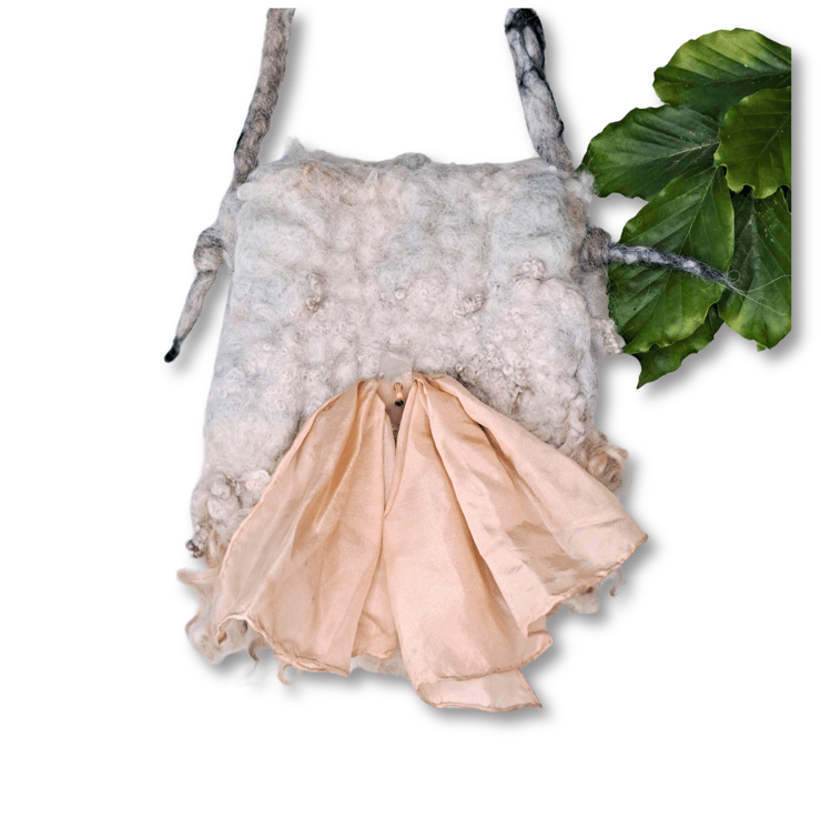 This tactile felt bag is made in British wool for daytime and evening looks. Handcrafted in natural wool fibre from a local farm, it features a flap with a secure silk button to match the silk lining inside this bespoke and sustainable design bag. The bag is handmade using wet felting technique on raw wool. The body of the bag is textured and tactile featuring real sheep curls.