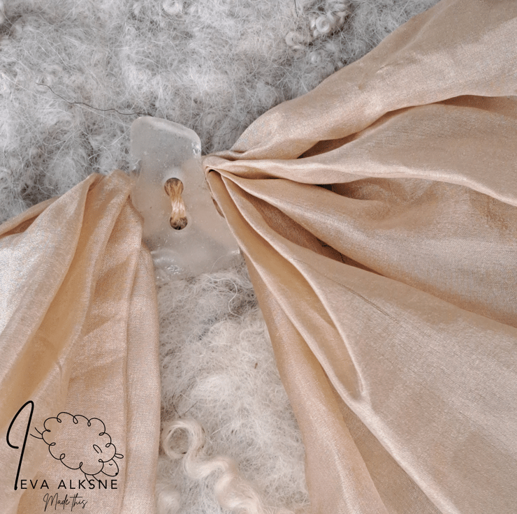 A recycled silk button, silk fabric for the lining and the bow, sea glass decorative button.