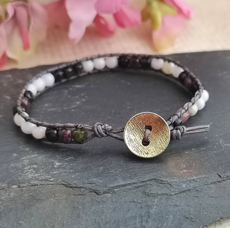 This bracelet features tiny tourmaline cubes and pink opal beads which have been attached to genuine leather cord.