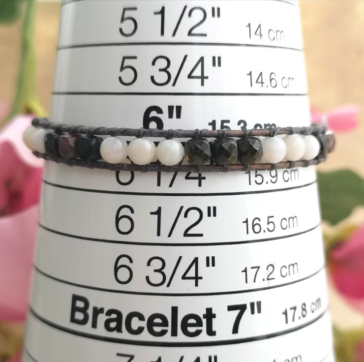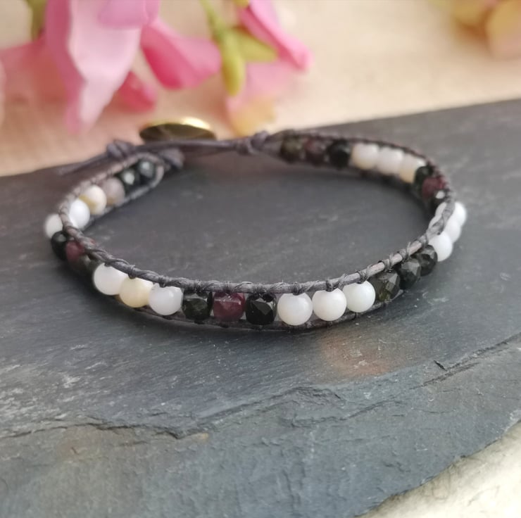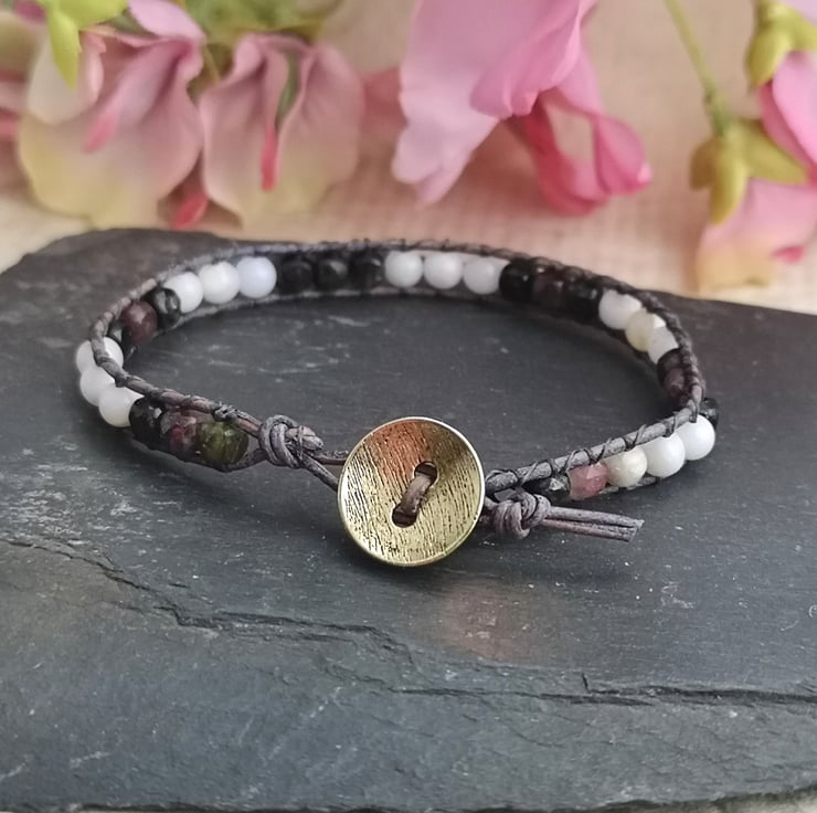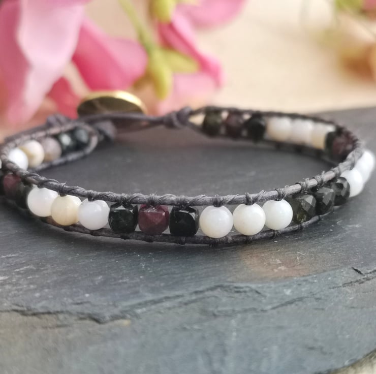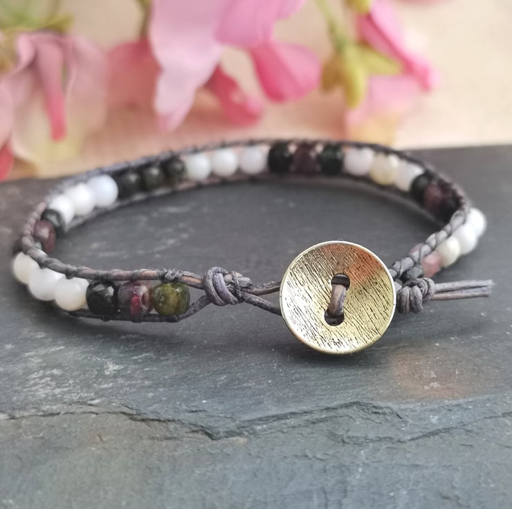 This bracelet features tiny tourmaline cubes and pink opal beads which have been attached to genuine leather cord.