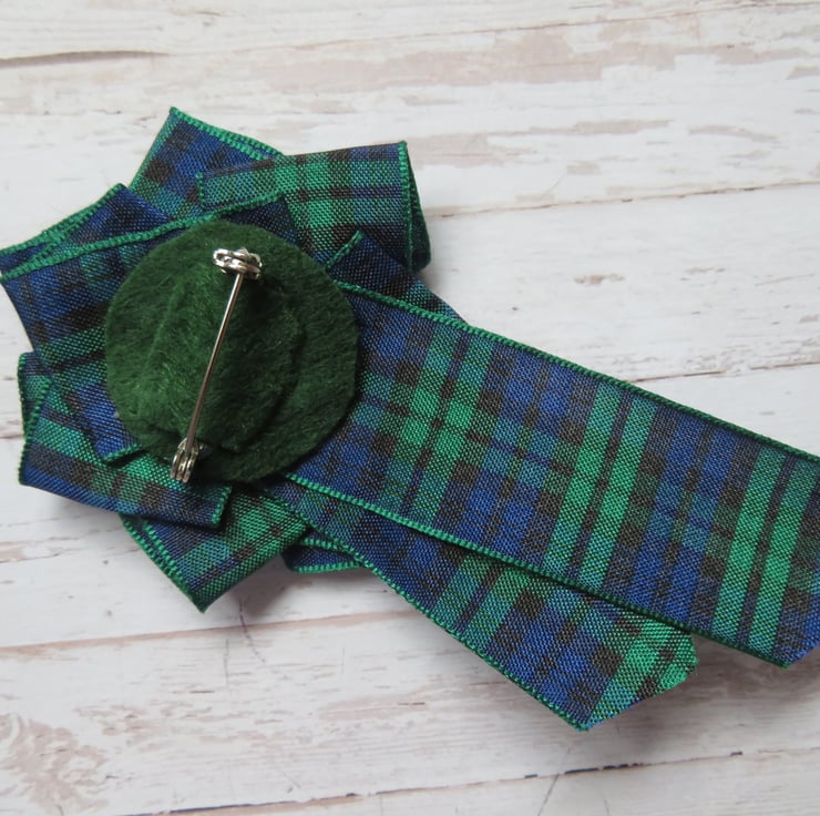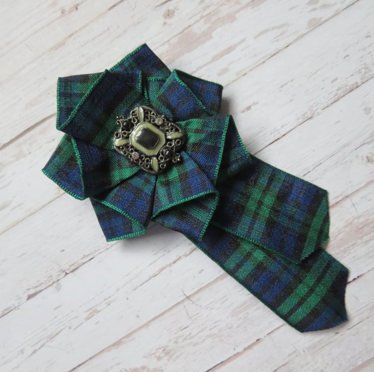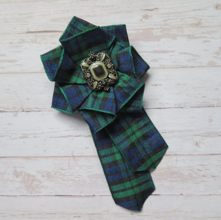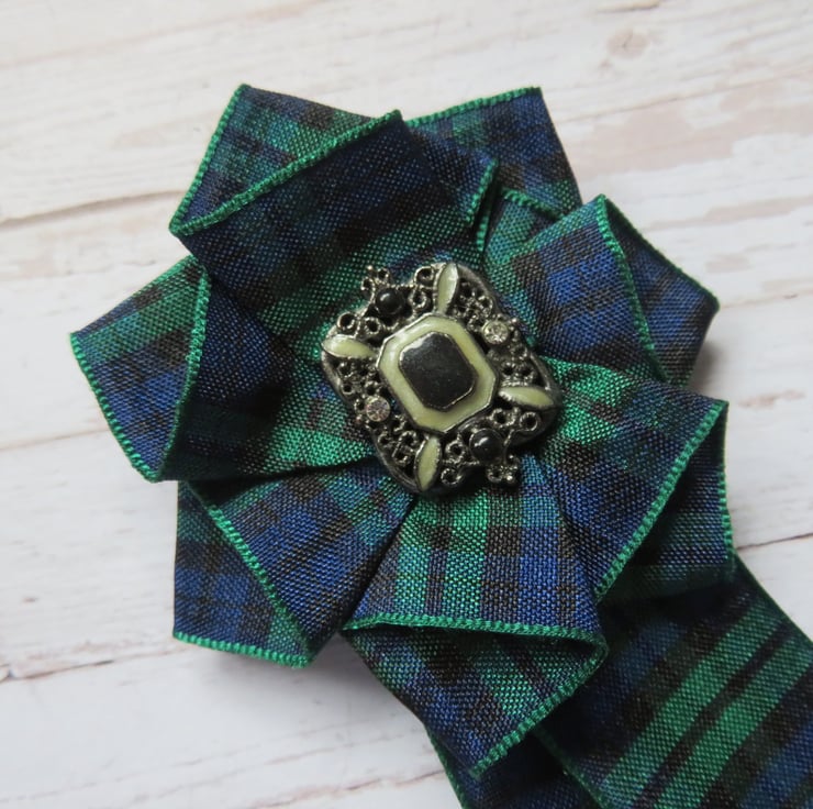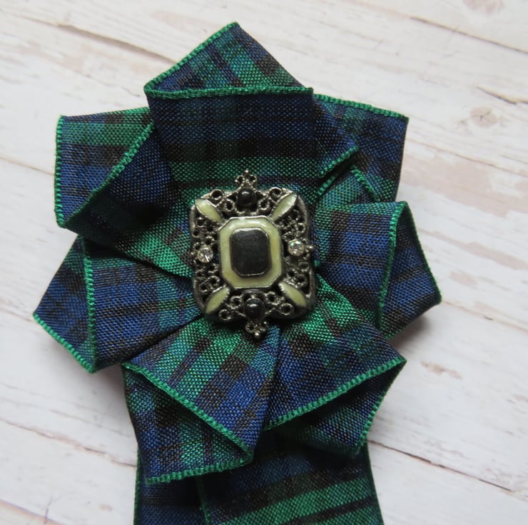 Made with a small circle of navy felt with a small brooch pin attached and a handmade and sewn ruffle of Black Watch tartan ribbon with wide ribbon shaped trails and finished with an antique look black, ivory & pewter cabochon.