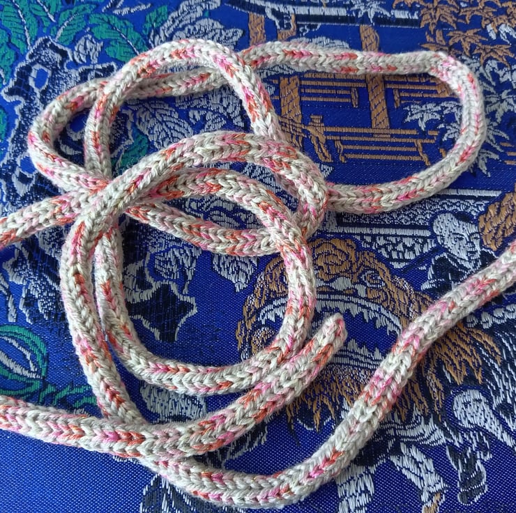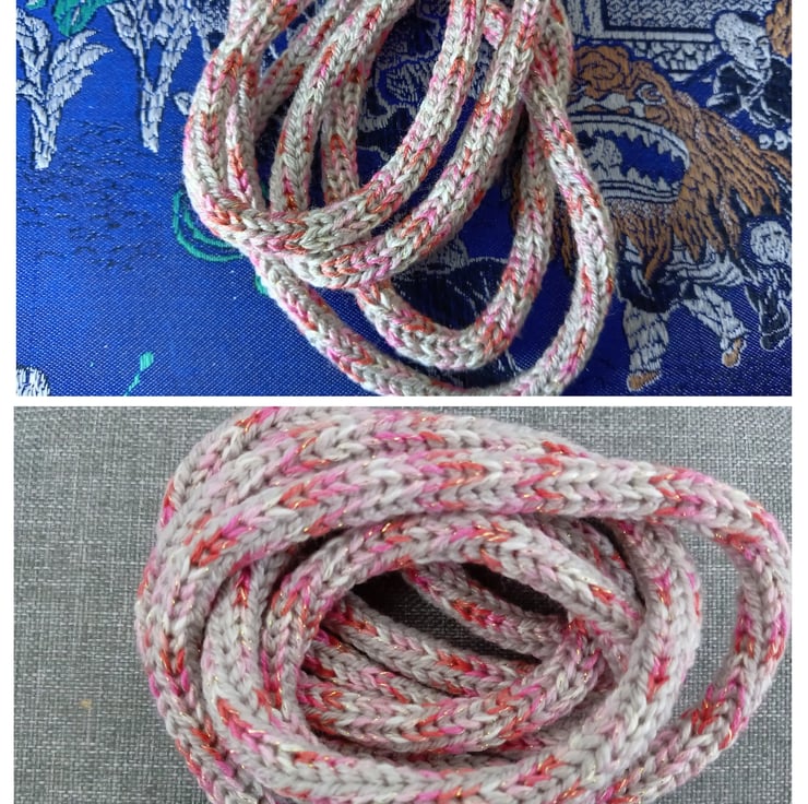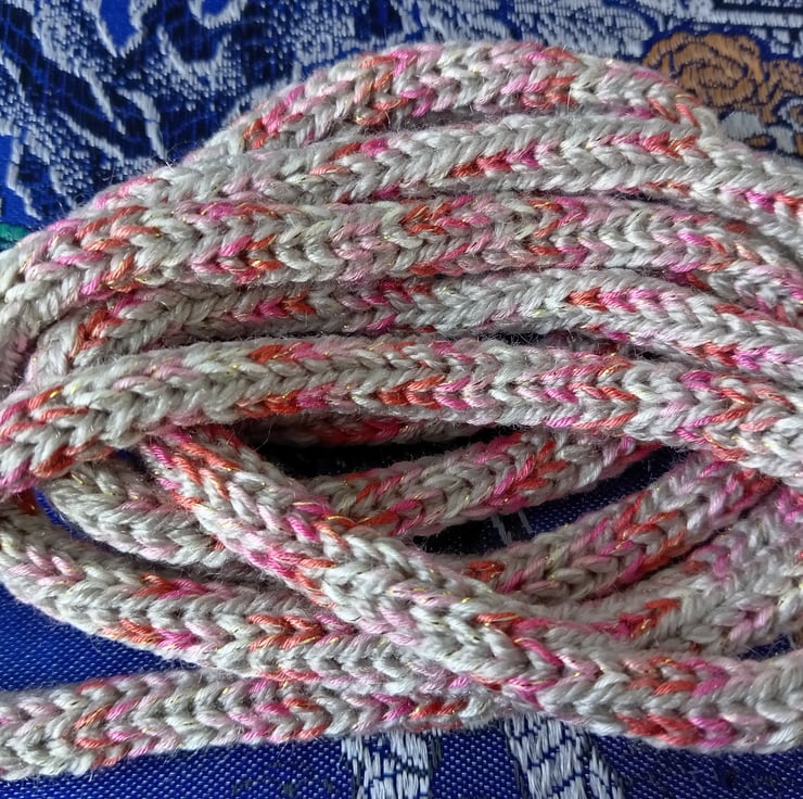 This is approx 1.5 meters and 9-10 mm wide. It is a mix of cotton, acrylic and lurex giving it a nice sparkle running through it. The colours are nice and soft with grey as the main colour and peach, pink and gold.