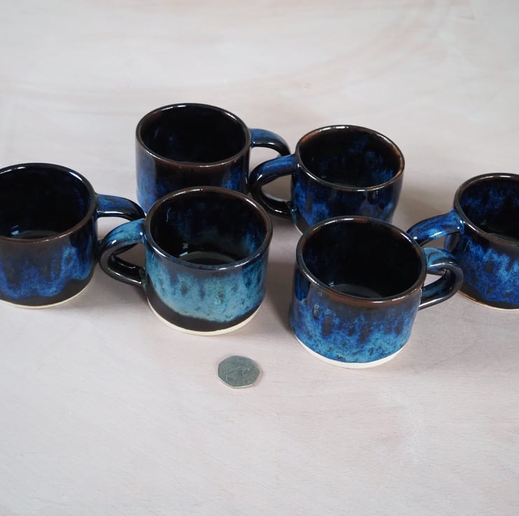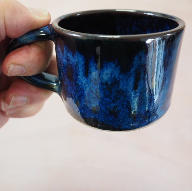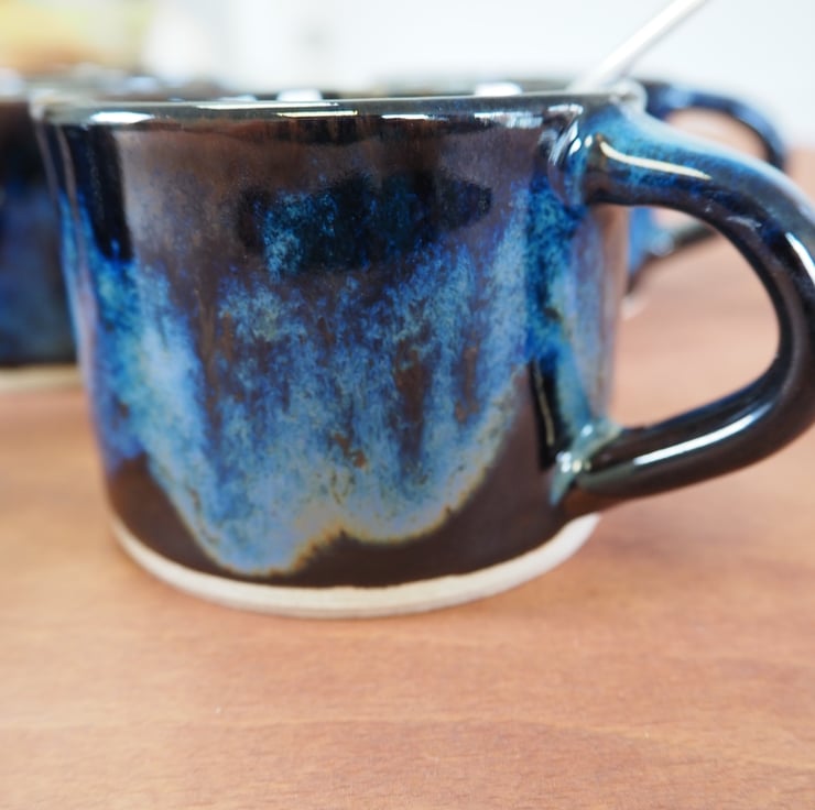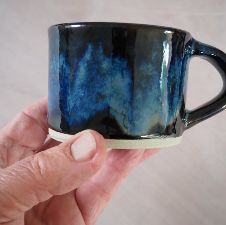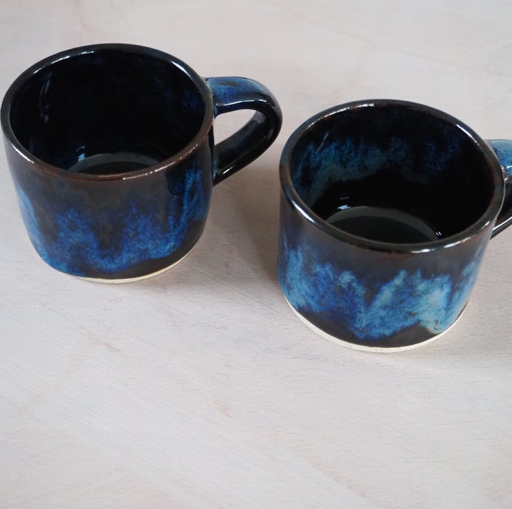 Set of two coffee or tea mugs, straight sided. Hand thrown stoneware on my potters wheel and finished in a glossy blue over black combination glaze. Perfect for cappuccino.