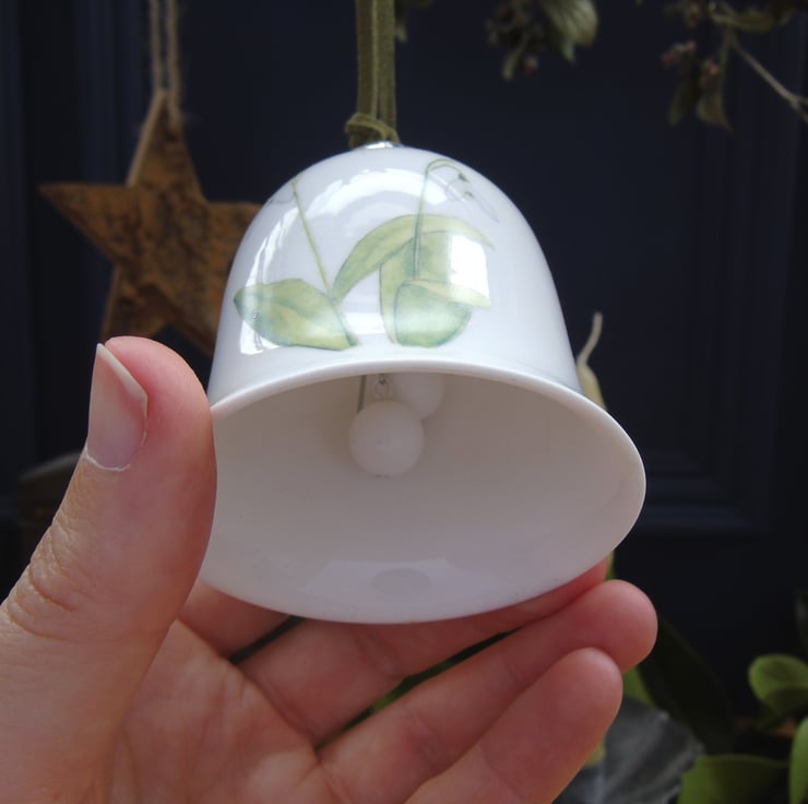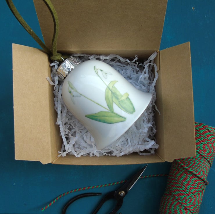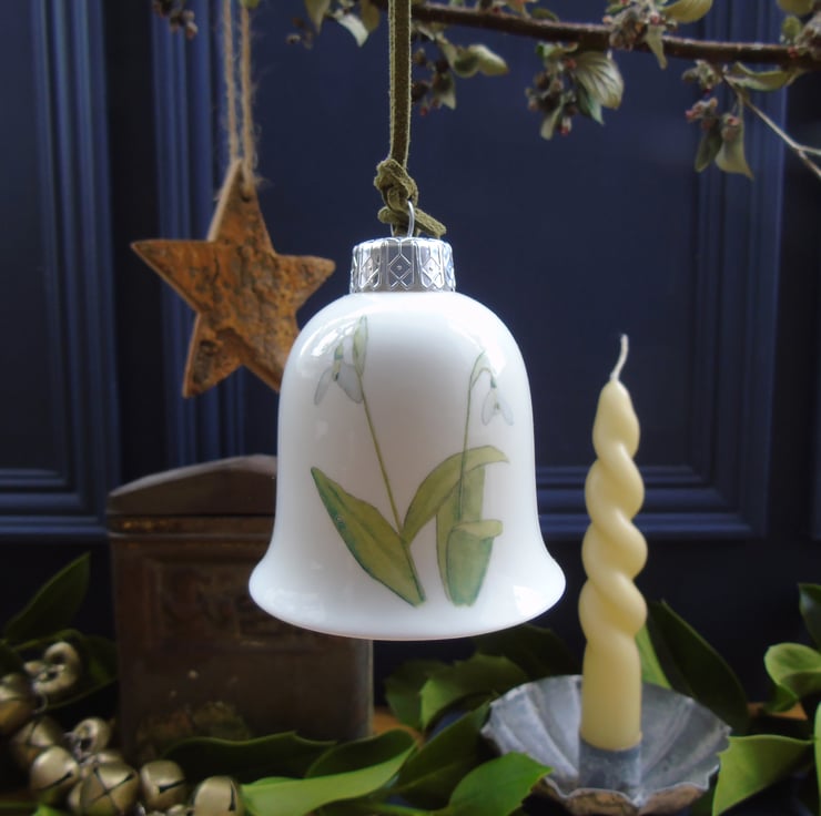 A British made fine bone china decorative bell featuring my delicate watercolour painting of snowdrops, a charming way to bring this symbol of light and hope into your home.