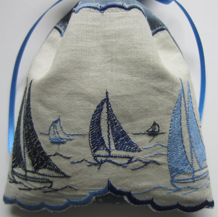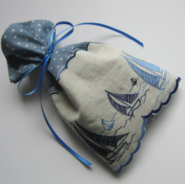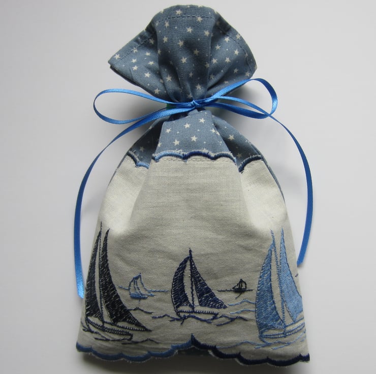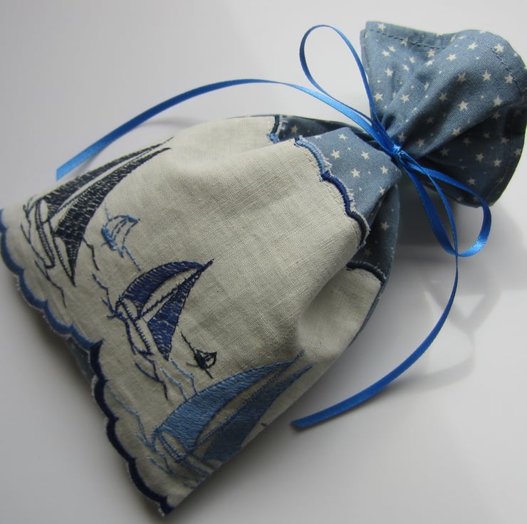 Lavender drawer sachet made from a blue and white star fabric and decorated with a vintage embroidered yacht design trim.