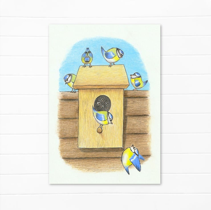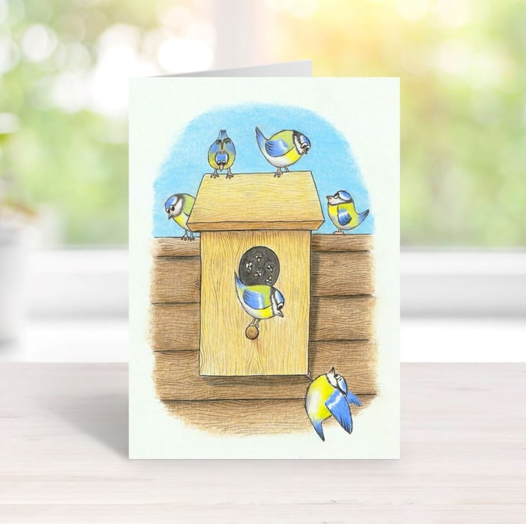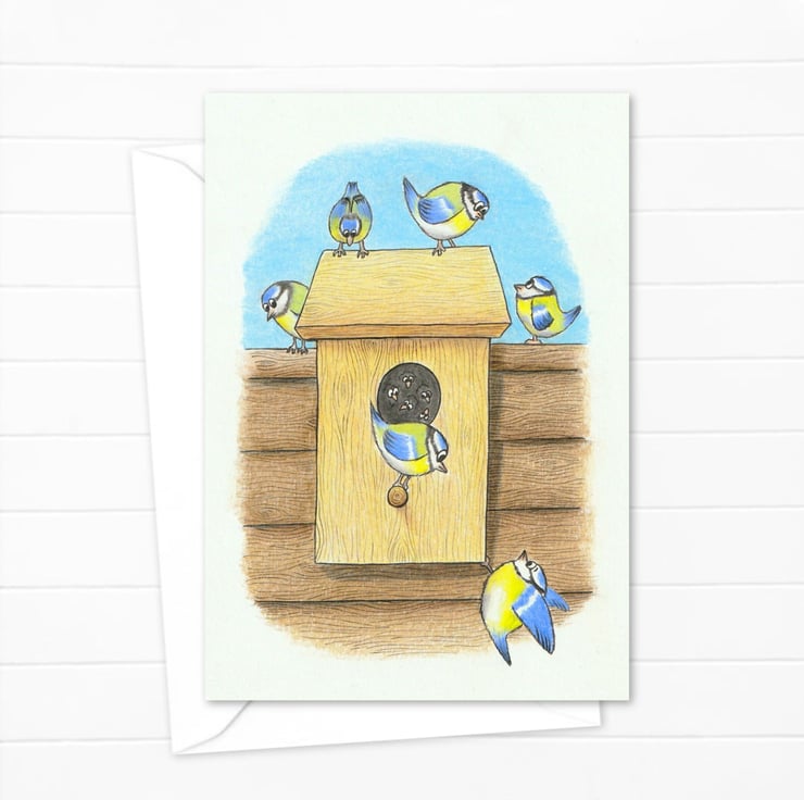 An original art greeting card, featuring a hand-drawn pencil illustration. An ideal card to send to the bird or small animal lover in your life! British garden birds enjoying nesting in their new home.