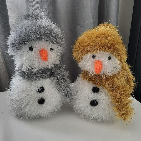 Hand knitted in super fluffy "snow" tinsel yarn, with a cute little gold tinsel bobble hat and scarf set (removable/exchangeable) - he won't melt before the big day!