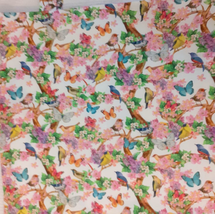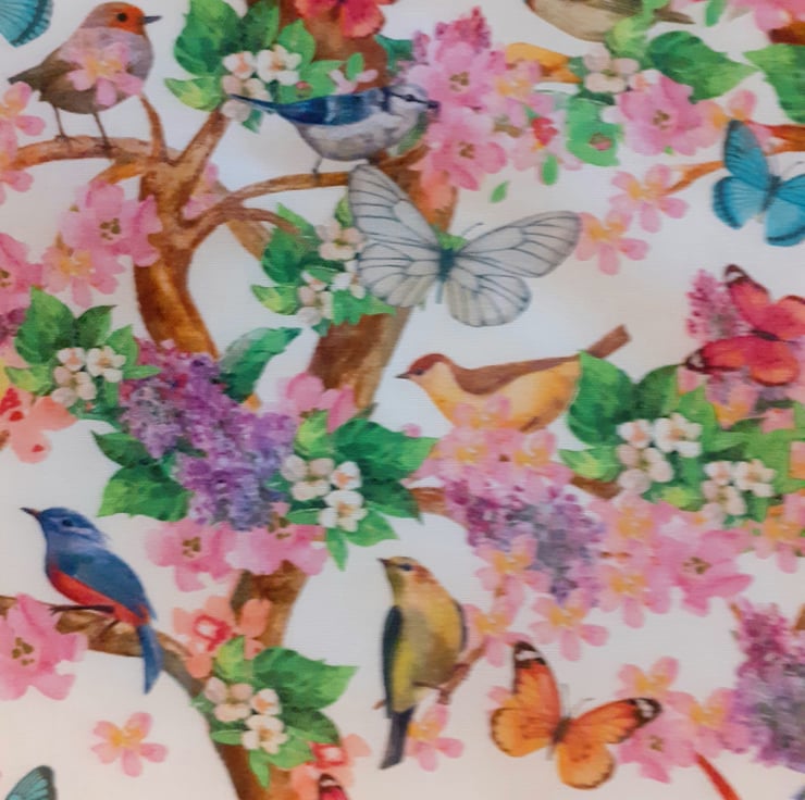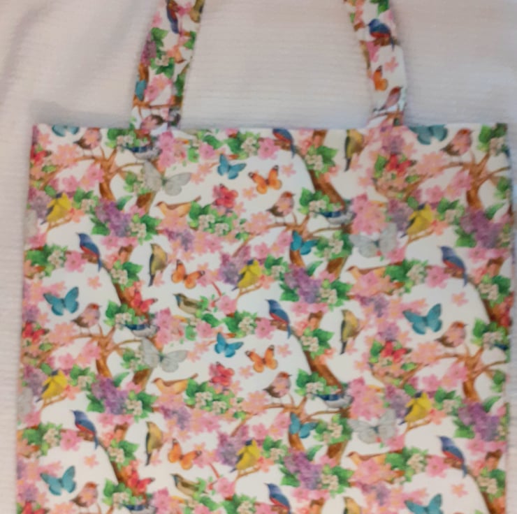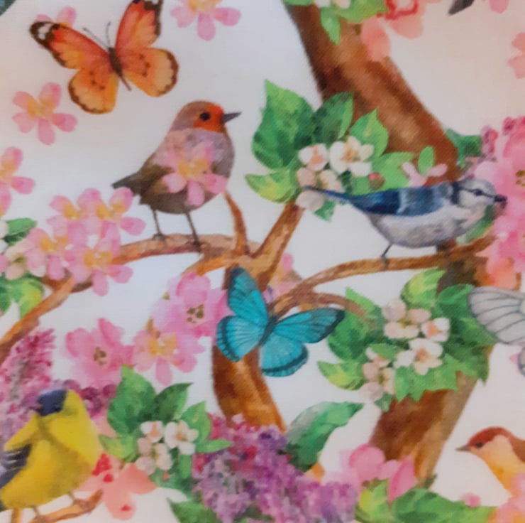 North American Songbirds cloth shopping/tote bag with lots of pretty songbirds and colourful butterflies flitting through flowering trees on a white cotton cloth bag . it can be folded to fit in a handbag, washable cotton fabric.