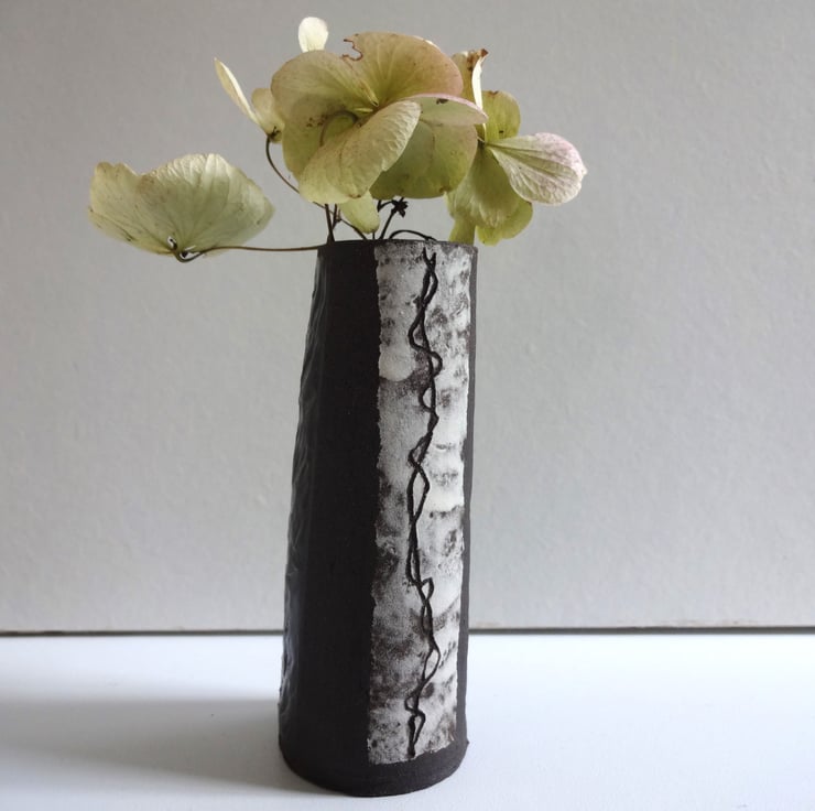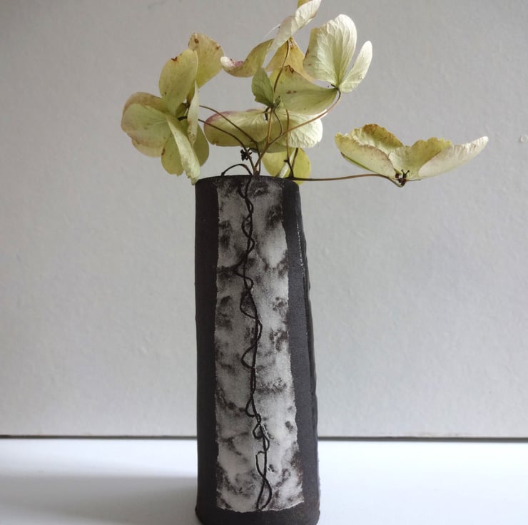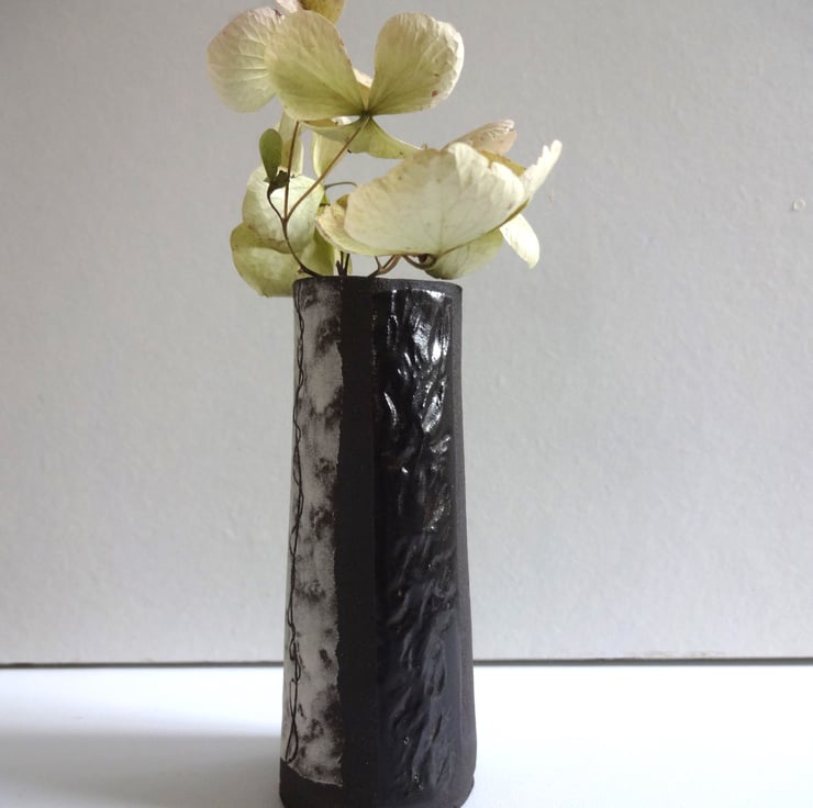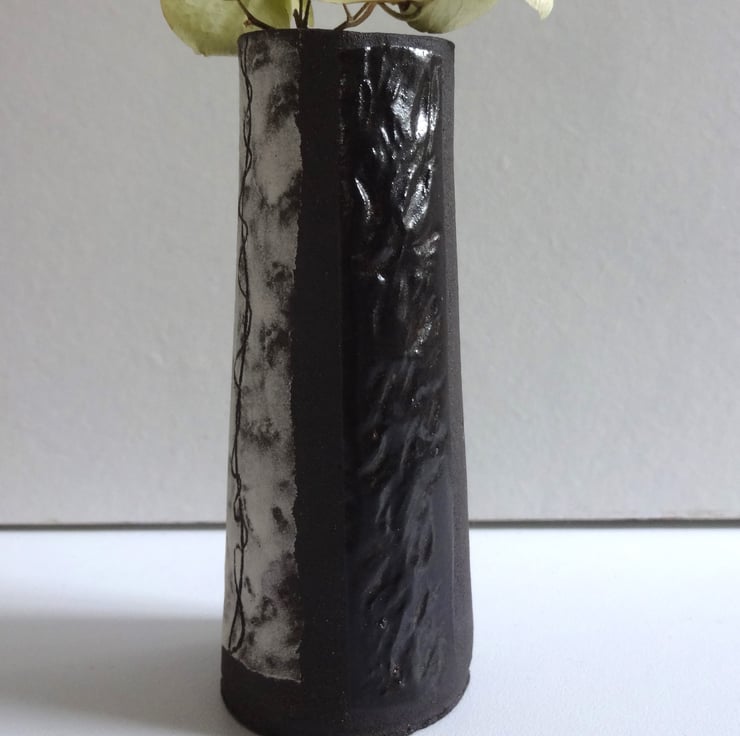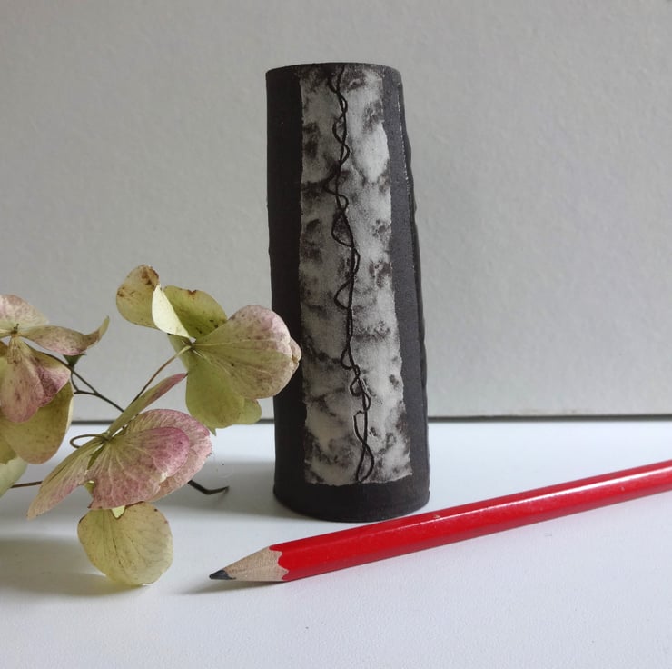Small handmade ceramic vase for a pretty bud or posy to brighten your breakfast table or desk top in the office. Looks good with white flowers to continue the monochrome theme, or equally eyecatching with a posy of really bright blooms like nasturtiums. Or you can keep a few pencils in it! In black stoneware clay I made a slightly tapered shape and textured some areas of the surface with a peach stone. I created panels of white slip and incised (a technique known as sgraffito) a twining design reminiscent of vine tendrils. The interior and the textured panels are glazed in iron lustre finish with a surface gloss, while the rest of the vase is the natural finish of the black clay itself. 10.5cm high x 4 cm diameter across the base. The base has my potter’s mark of a swallow in flight impressed into the clay before firing. From my Mono Collection of individual pieces, each one different but to a black and white theme.