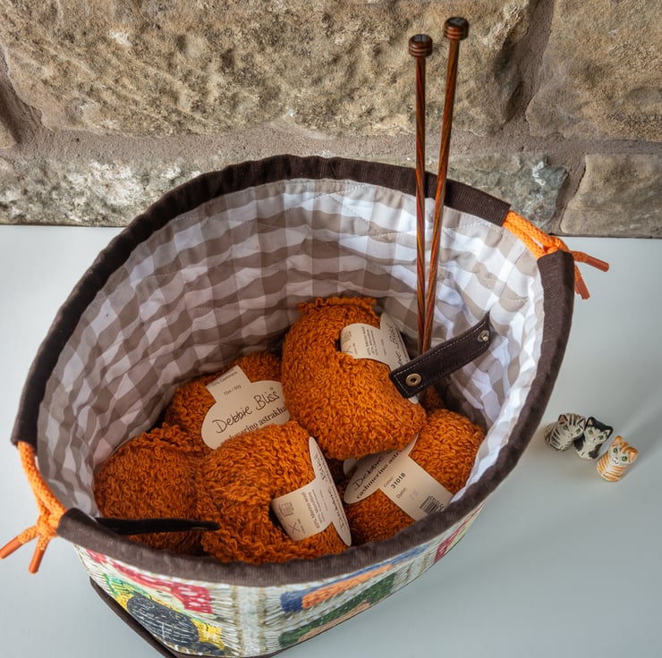 You can see the size of the bag in the photos and I've also added a photo of the open bag with eight 50g balls of wool inside, to illustrate how much room there is for your yarn and work in progress. The outer of the bag is interfaced with woven cotton for longevity and strength and closes with soft woven cotton cord. There are two yarn guides inside that open and close with metal poppers.