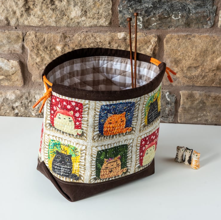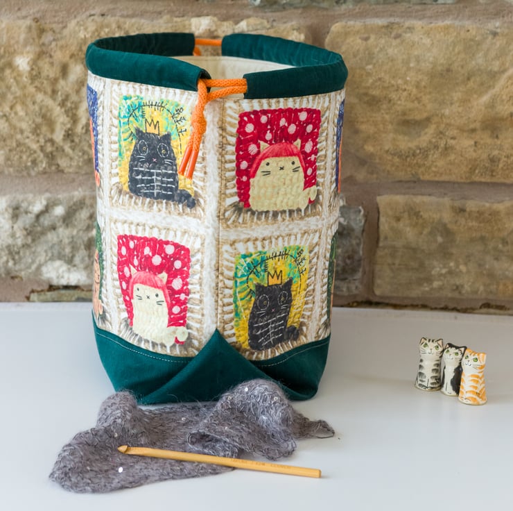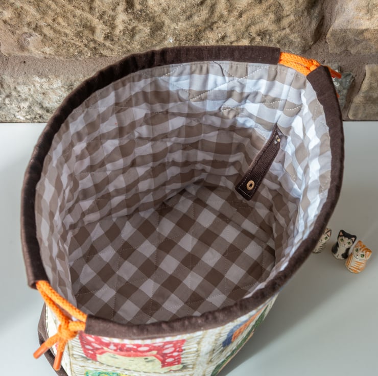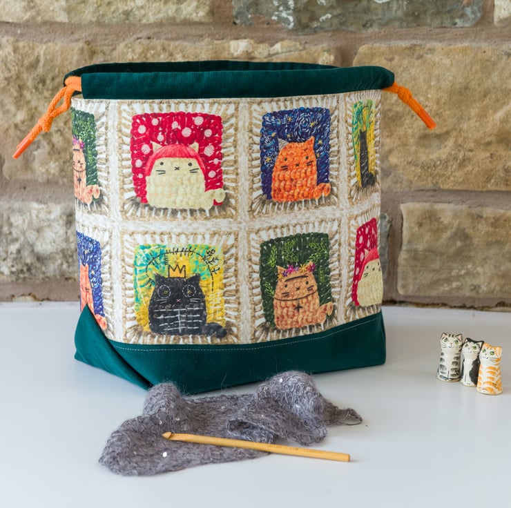 If you love cats and crochet, this may be the perfect bag for you! This medium sized drawstring bag is made with a gorgeous print by Achi Acho Design called 'Artist Mewses' featuring crocheted cat characters against a granny square background. I've partnered the print with soft and tactile baby cord in a choice of two colours and added a quilted natural cotton lining that has a gingham print on one side and a solid beige on the reverse - you can choose which you'd like (see last photo to see the two sides).