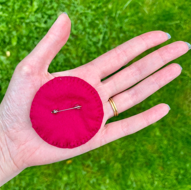 Hand crafted and hand stitched using fine embroidery thread onto wool felt, this circular brooch depicts a bright and colourful pink and purple flower.