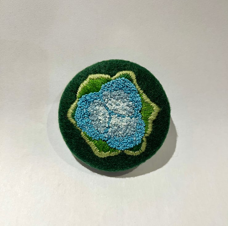 Hand crafted and hand stitched using fine embroidery thread onto wool felt, this circular brooch depicts a delicate blue flower.