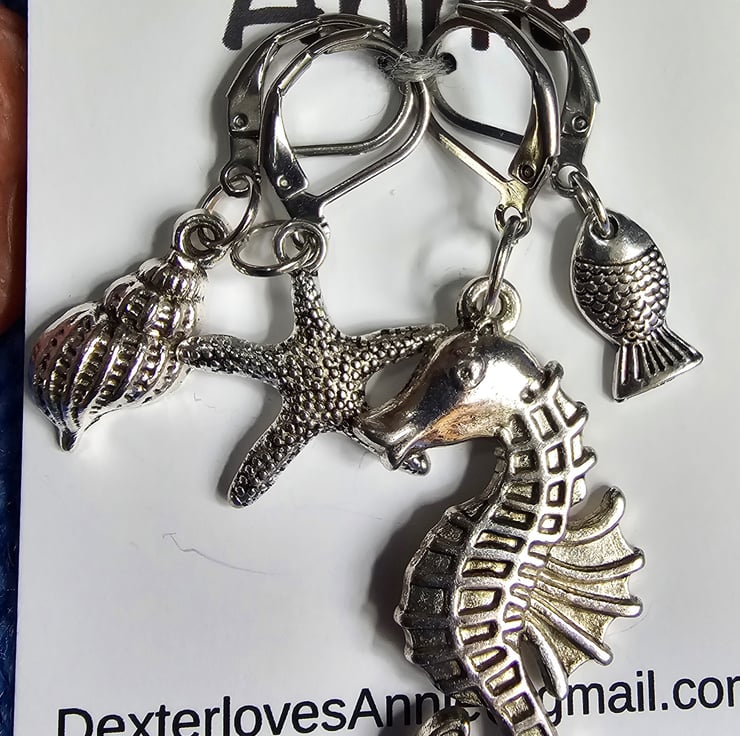 This is a set of 4 silver toned sea themed stitch marker / progress keepers
