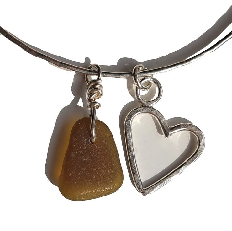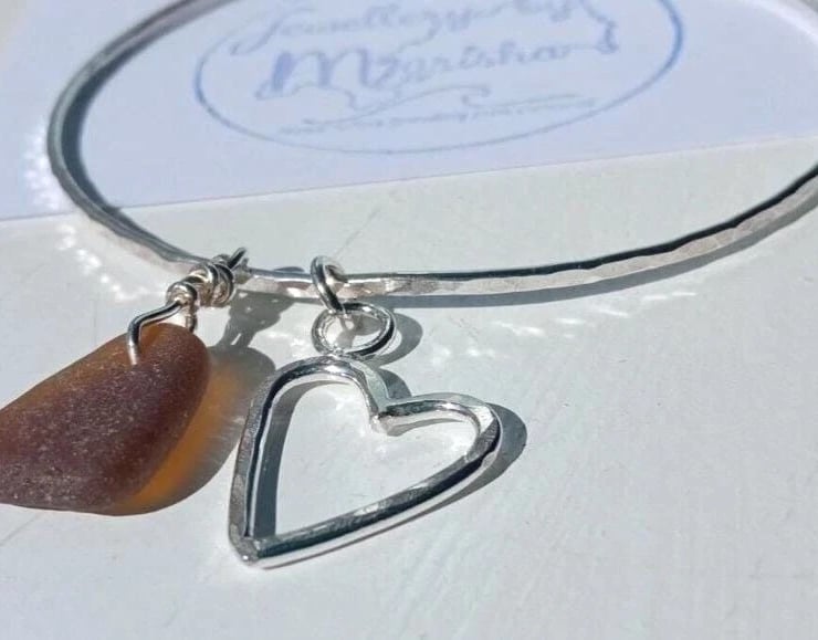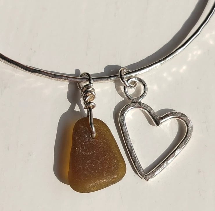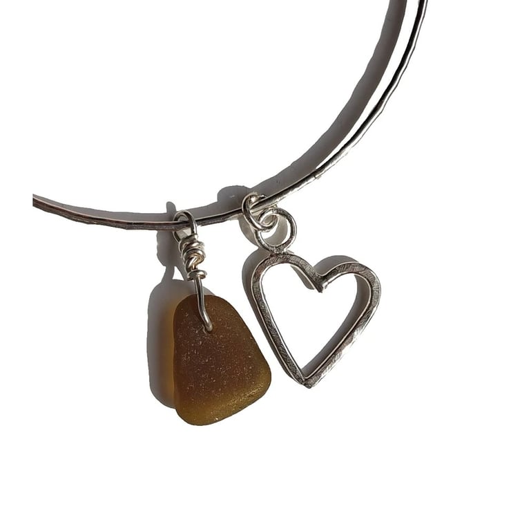 Seaglass & Heart Bangle Sterling Silver 925 Jewellery Gift Hammered Bracelet