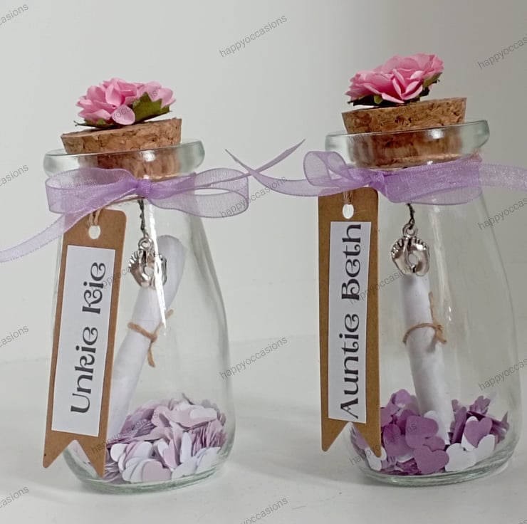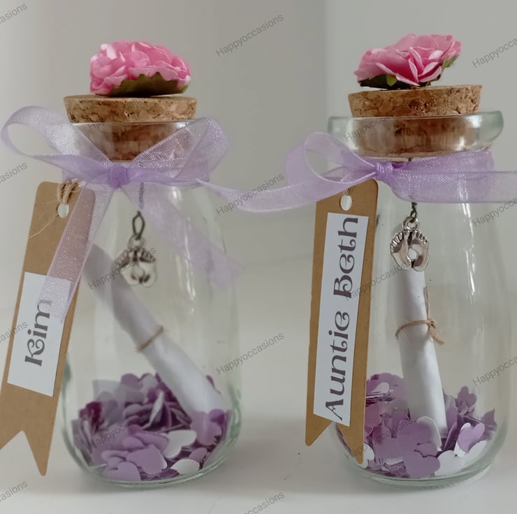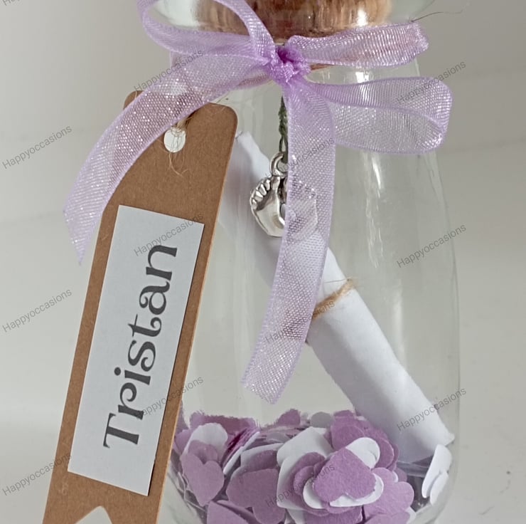 we add small paper heart confetti to the bottom, then the silver coloured baby feet, once that's done we add the personalised scroll. Please see photos for the description and the details of the poem.