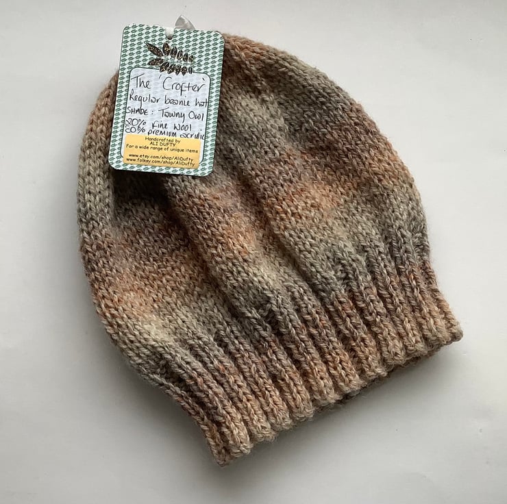 I have designed and knitted this unisex ,regular beanie hat using a lovely , soft , wool blend yarn . Very lightweight , warm and comfortable.