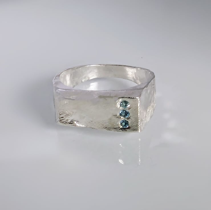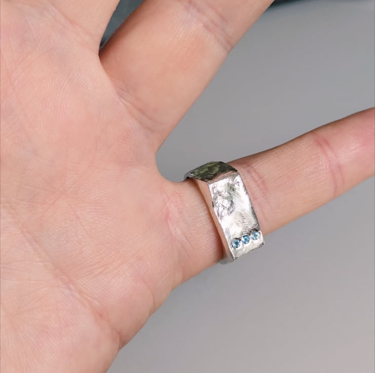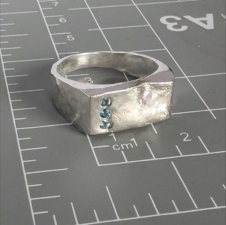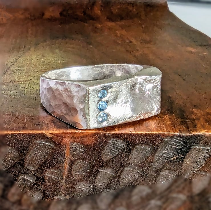 Sterling silver fire textured, hammered & reticulated. Embellished with three Swiss blue topaz gemstones.
