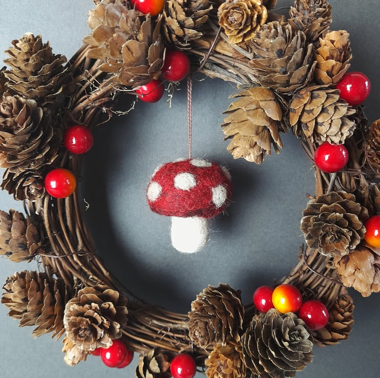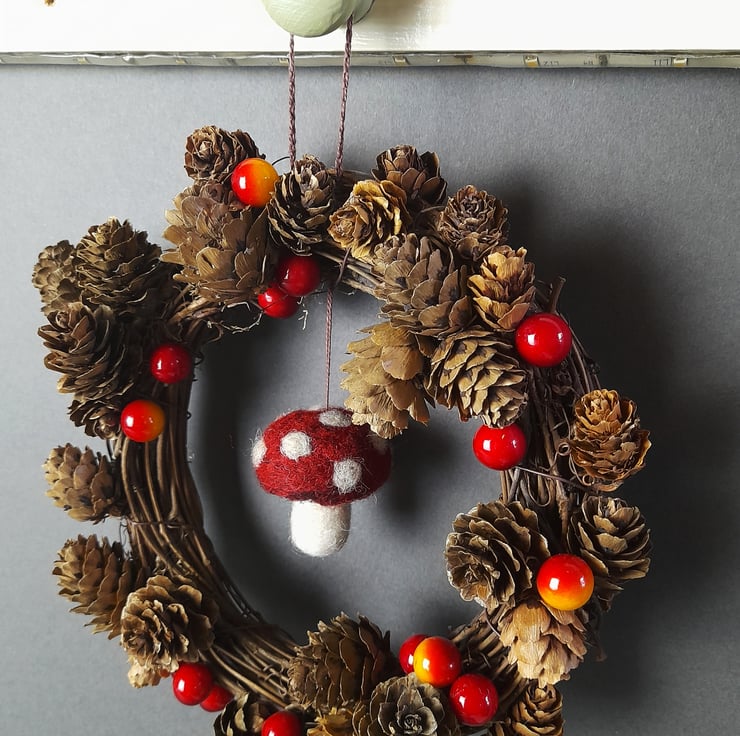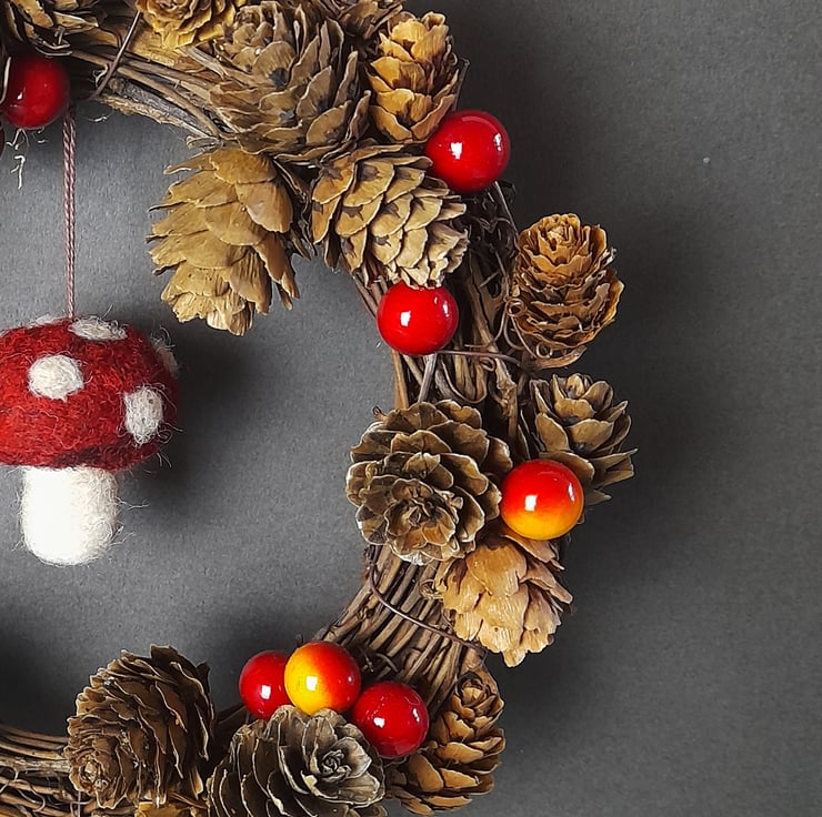 The wreath itself is made from a blend of natural twigs, stems, and curly vines, the cute little red and white toadstool is made by needle felting using natural wool fibres. The fir cones are real but the orange and red winter berries are artificial, so this wreath will last many years.