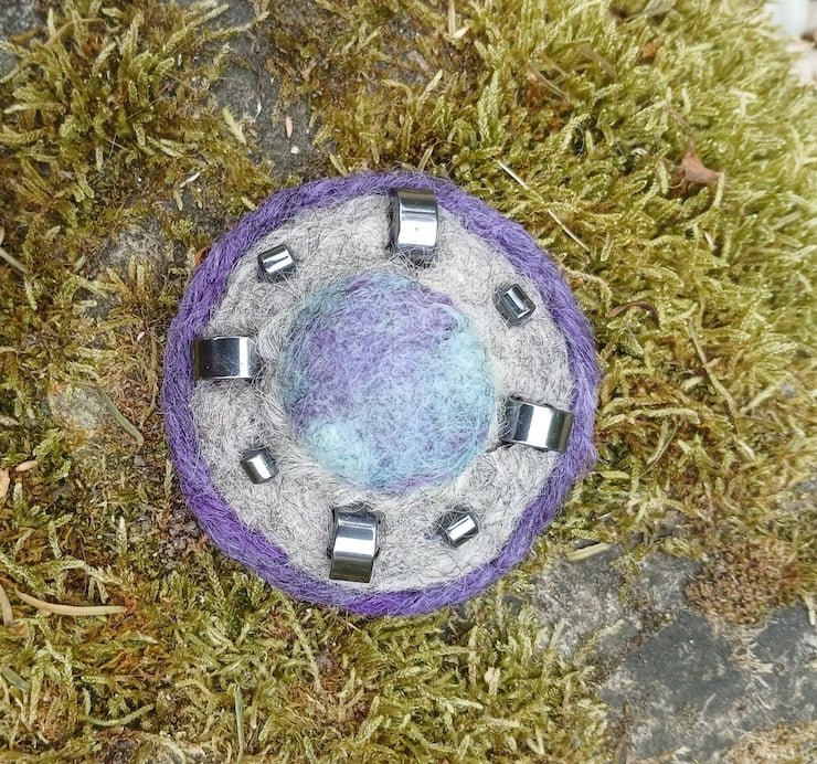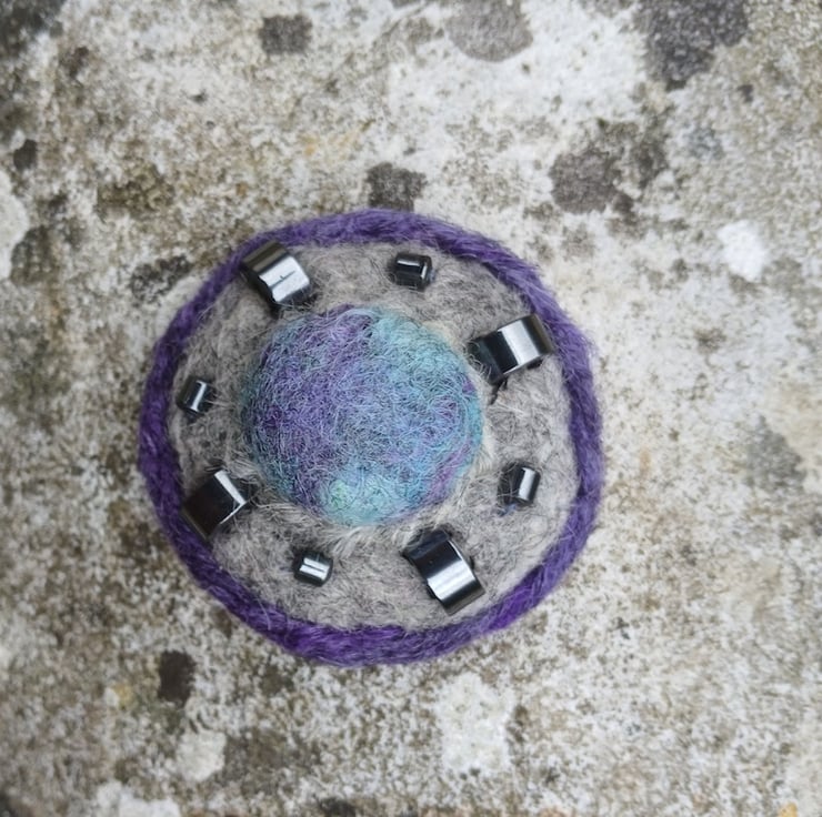This brooch is needle felted using Gotland fleece. It is in the style of a Viking Shawl brooch.
