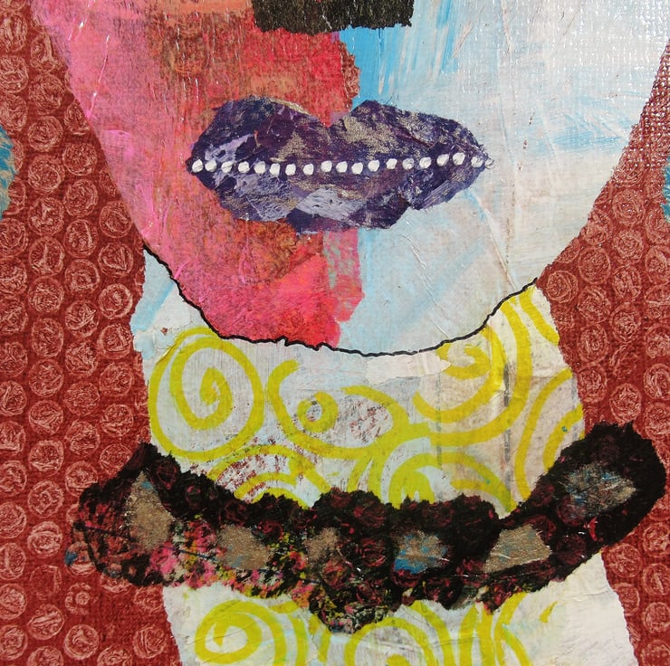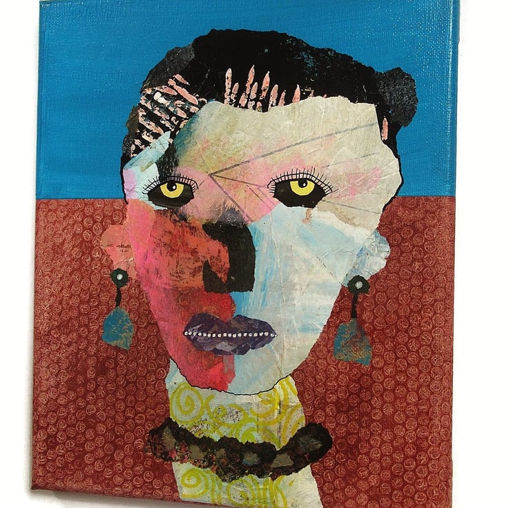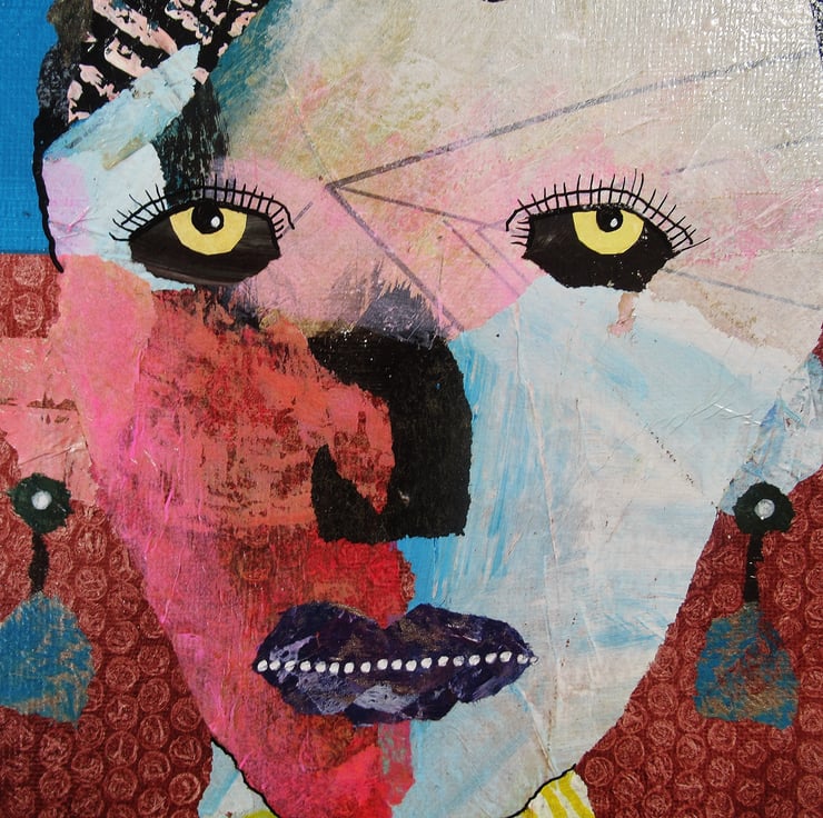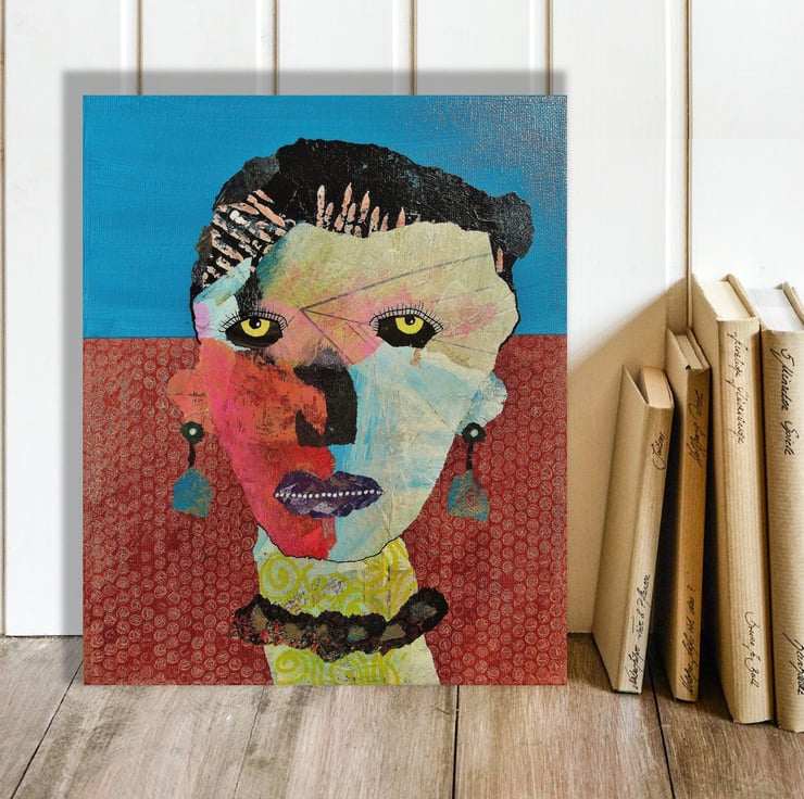 Unusual, slightly surreal portrait / figure painting combining acrylic, collage and drawing pens on 10 x 12 inch stretched canvas. The sides of the artwork are painted so no frame is necessarily needed - just unpack and hang. It would also slip easily into any standard 10 x 12 inch deep frame. Unusual, folk, outsider, art brut, primitive style artwork which is signed up the edge by Bea. With a soft sheen surface finish, this beautiful and unusual painting would make a striking focal point on any wall.