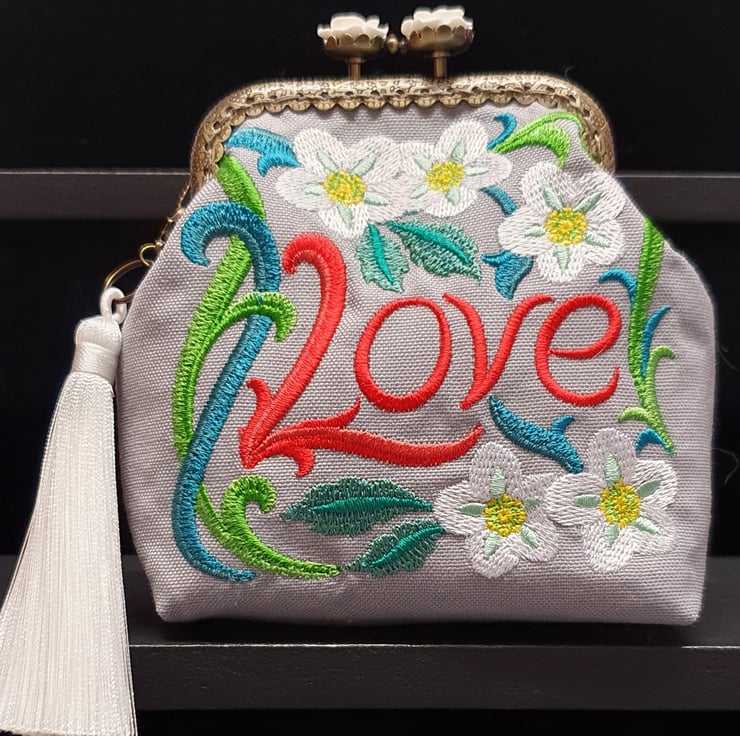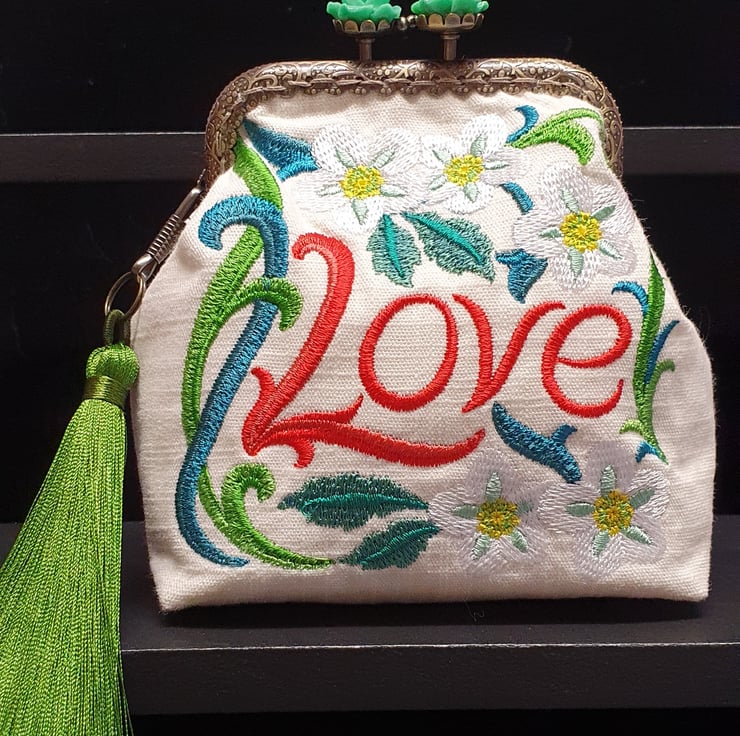 Purses have a kiss lock frame with an unusual and beautiful rose clasp.