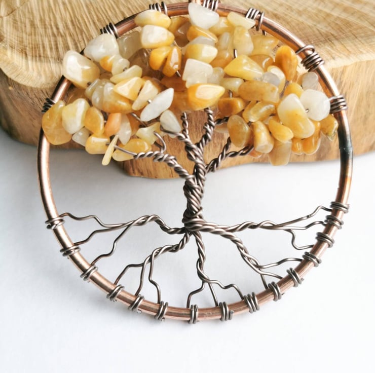 The wire sculpture holds jade crystals to represent blossom on the tree of life. It is situated on a 3 inch copper frame. I have used antique bronze copper wire to structure the Tree