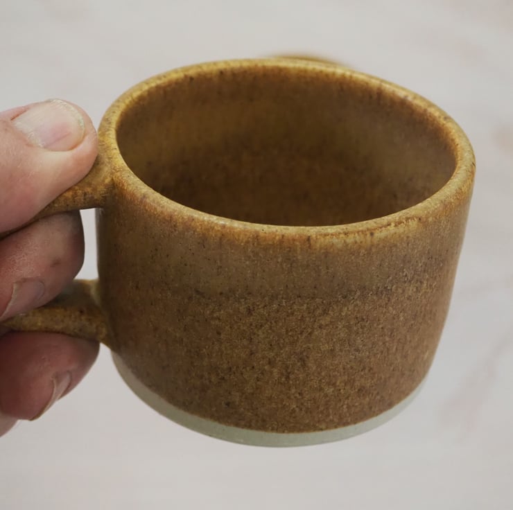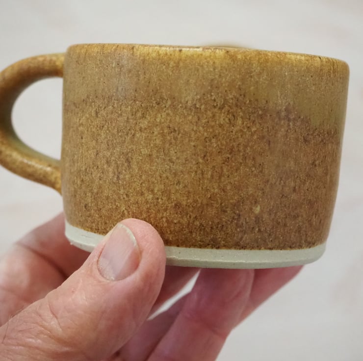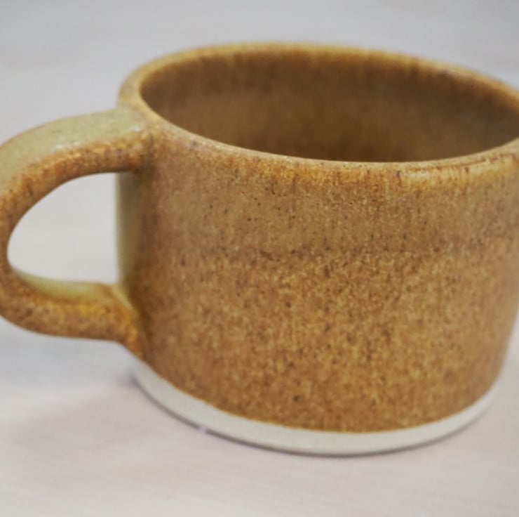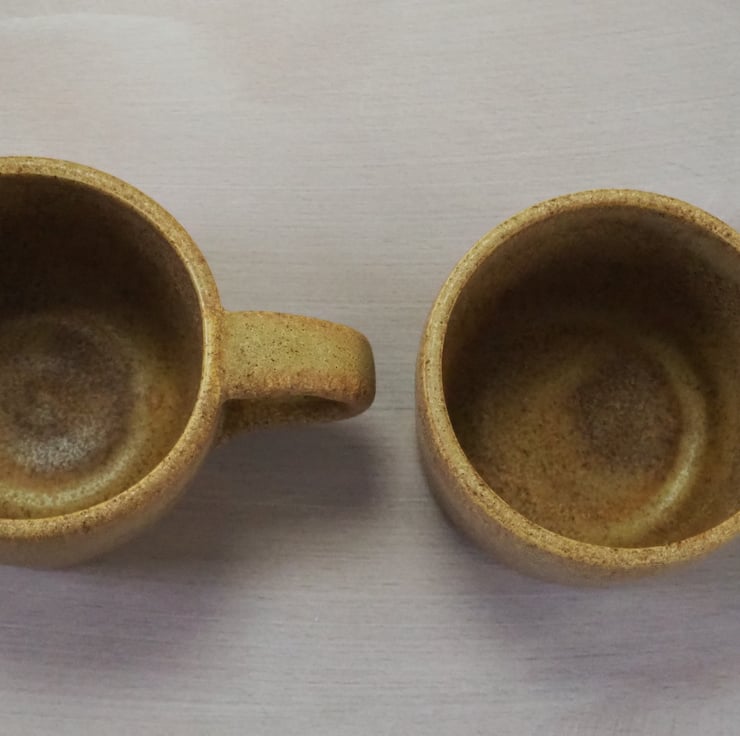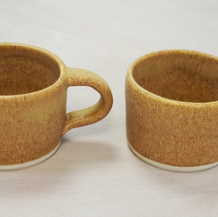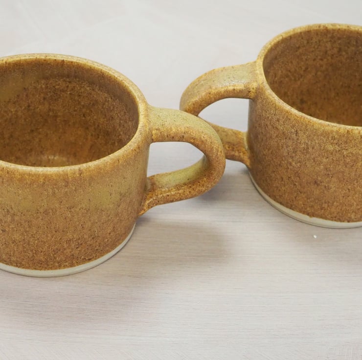 Set of two coffee or tea mugs, straight sided. Hand thrown stoneware on my potters wheel and finished in a toasty satin sand colour glaze. Perfect for cappuccino.