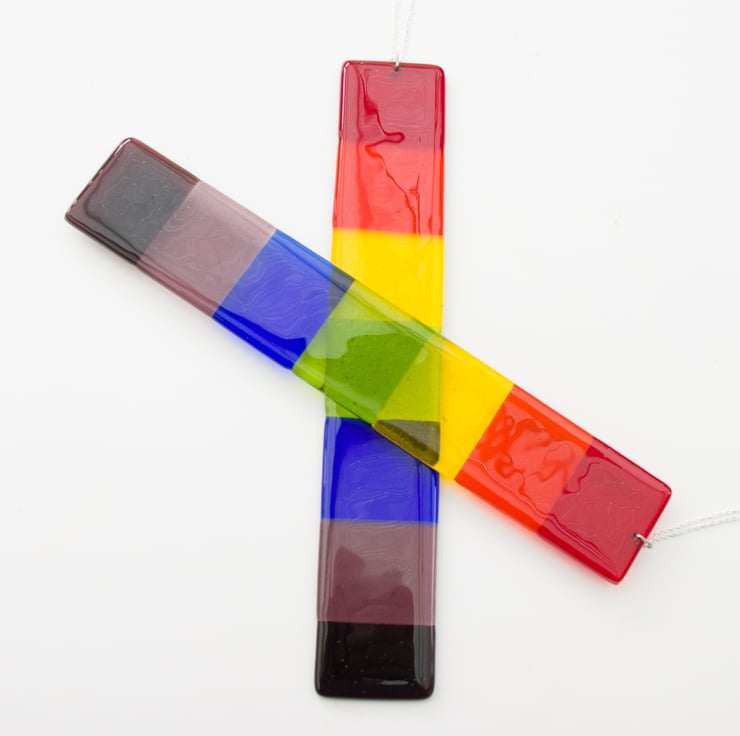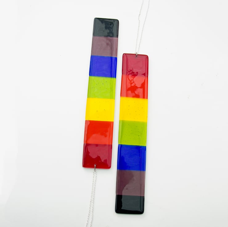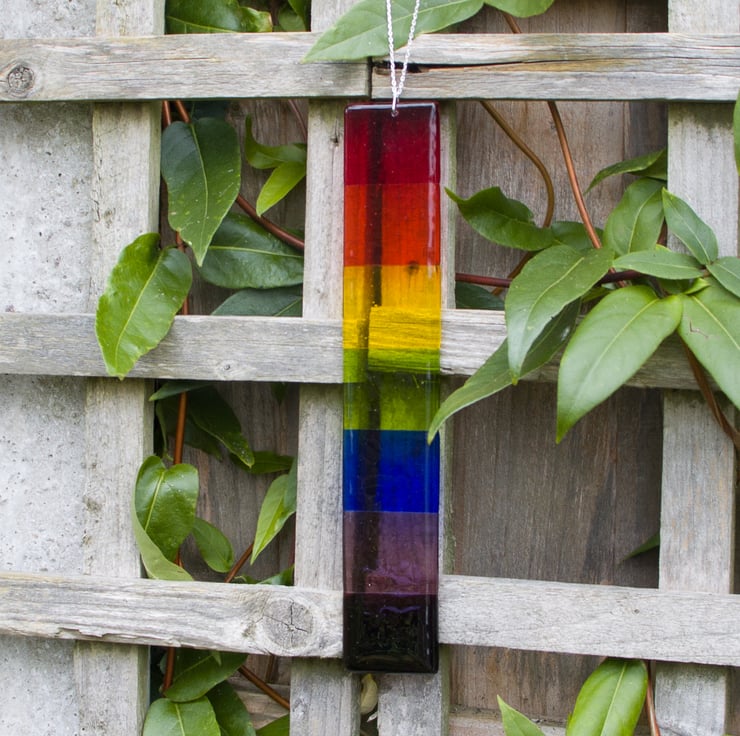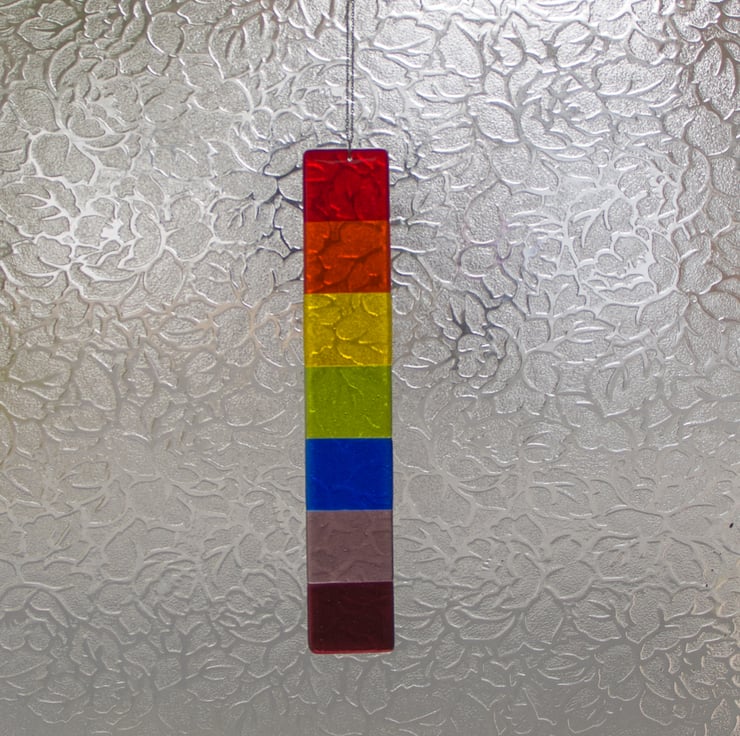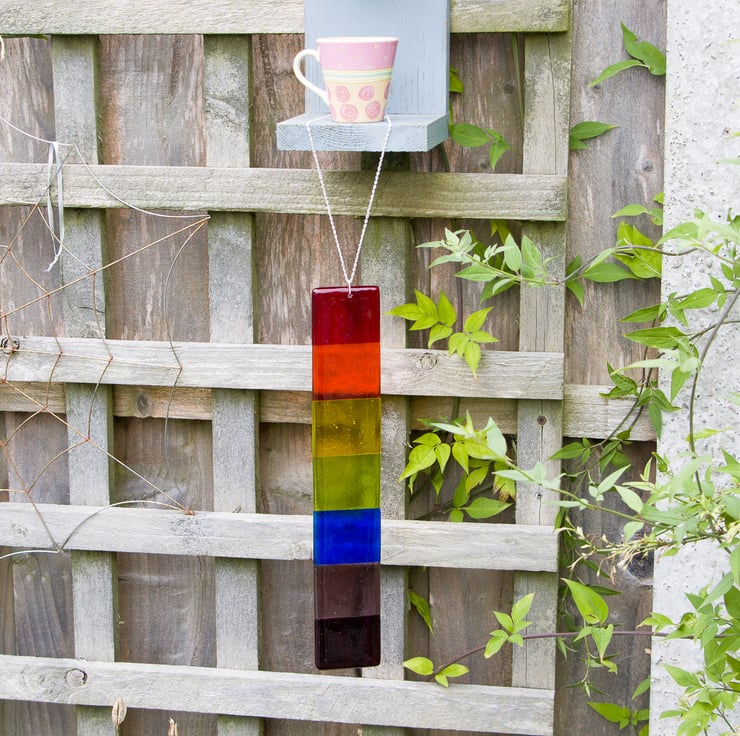 Suitable for hanging in a window or in the garden, it has been made from pieces of hand-cut glass decorated with pre-prepared dots. A session in the kiln fuses everything together. When it's cool we drill a hole & mount the stainless-steel chain from which it hangs. It is approximately 32cm long and 5.5cm wide. It weighs in at around 275gms.