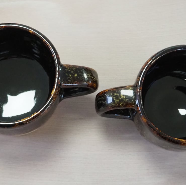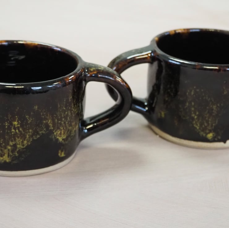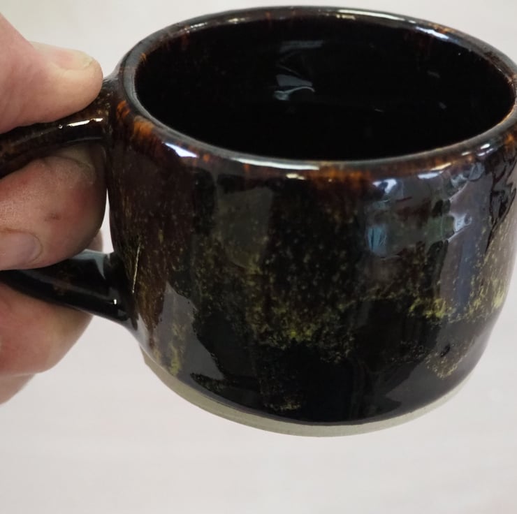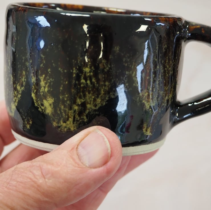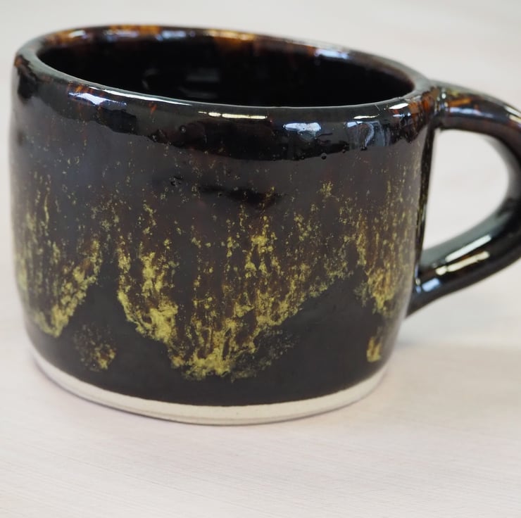 Coffee or tea mug, straight sided. Hand thrown stoneware on my potters wheel and finished in a glossy black/yellow/green combination glaze. Perfect for cappuccino.