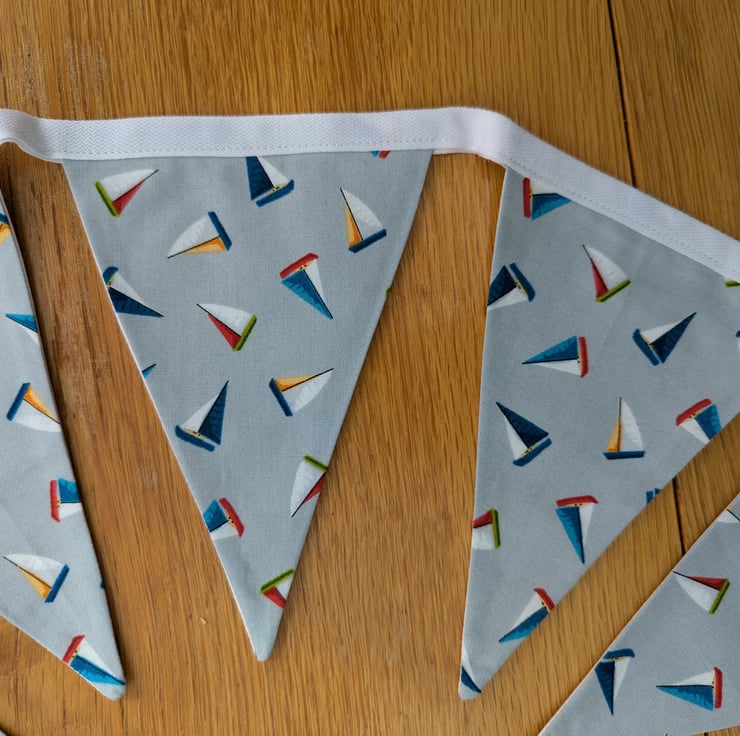 This bunting could be used in lots of settings, including a child's bedroom, playroom or even in a beach hut. There are lots more possibilities. It is made from fabric featuring colourful sailing boats and a pale grey background. The white tape measures 2.7 metres total, with the measurement from first to last flag being approx. 1.9m (75 inches). This gives a generous length of bunting, with ties at each end for hanging. Each of the 14 flags is 16cm (6.5 inches) deep.