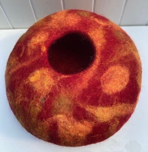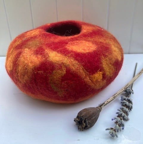 This pretty handmade, one-off felted piece depicting the rich colours of Autumn leaves has been made using merino wool. The bowl has been created using the wet felting process, which involves manipulating wool to create felt and then shaping into a bowl.