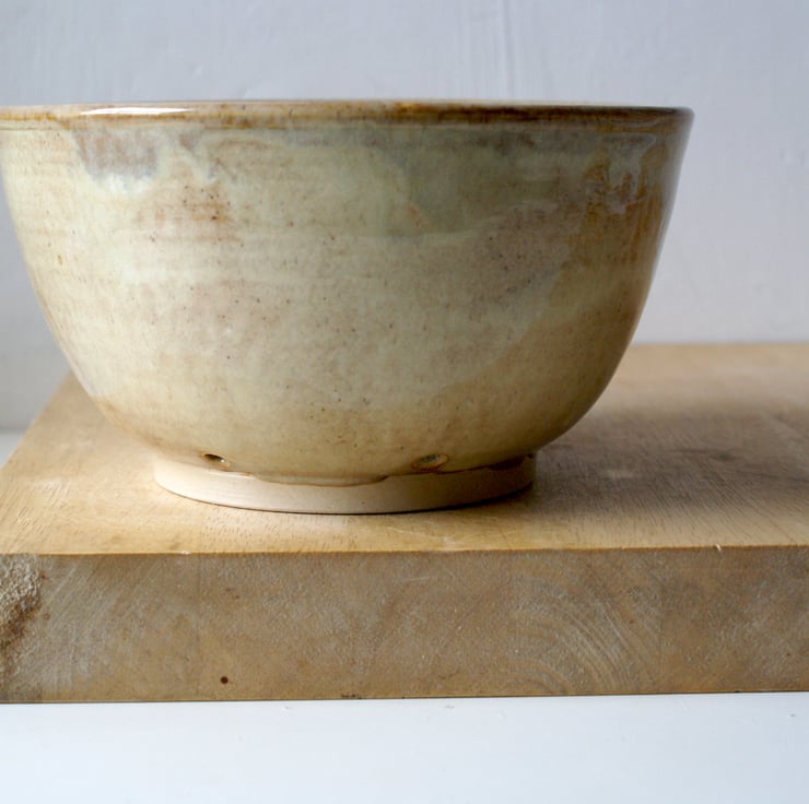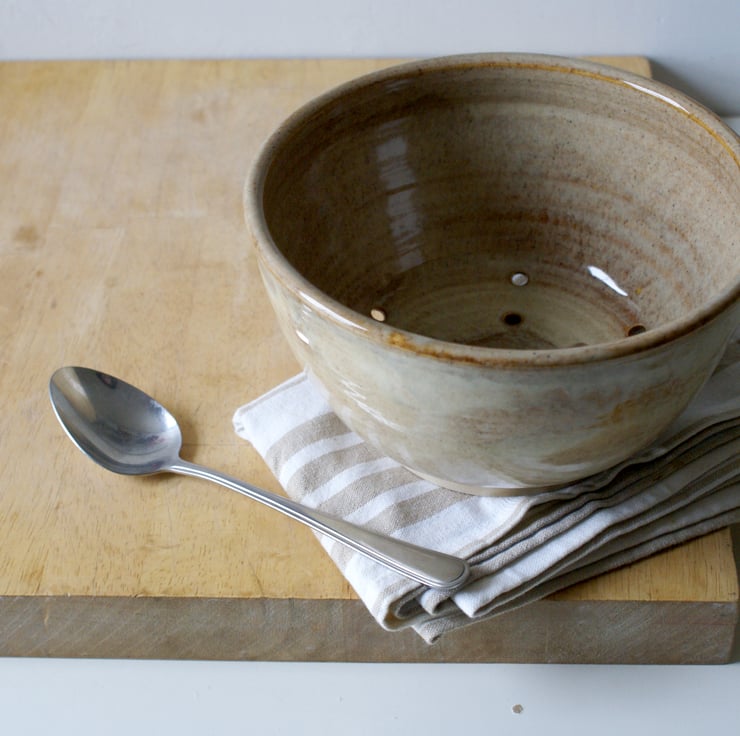 Pottery colander berry bowl wheel thrown and glazed in pebble grey.