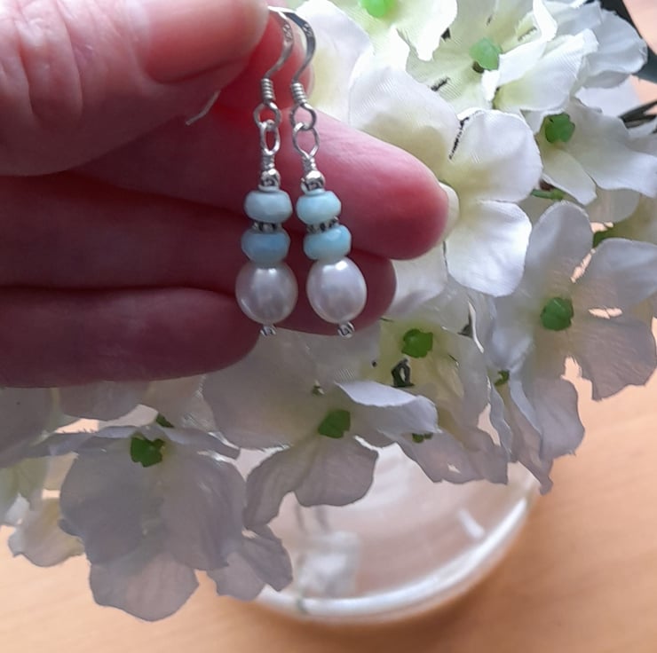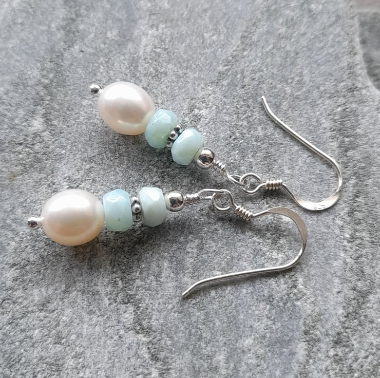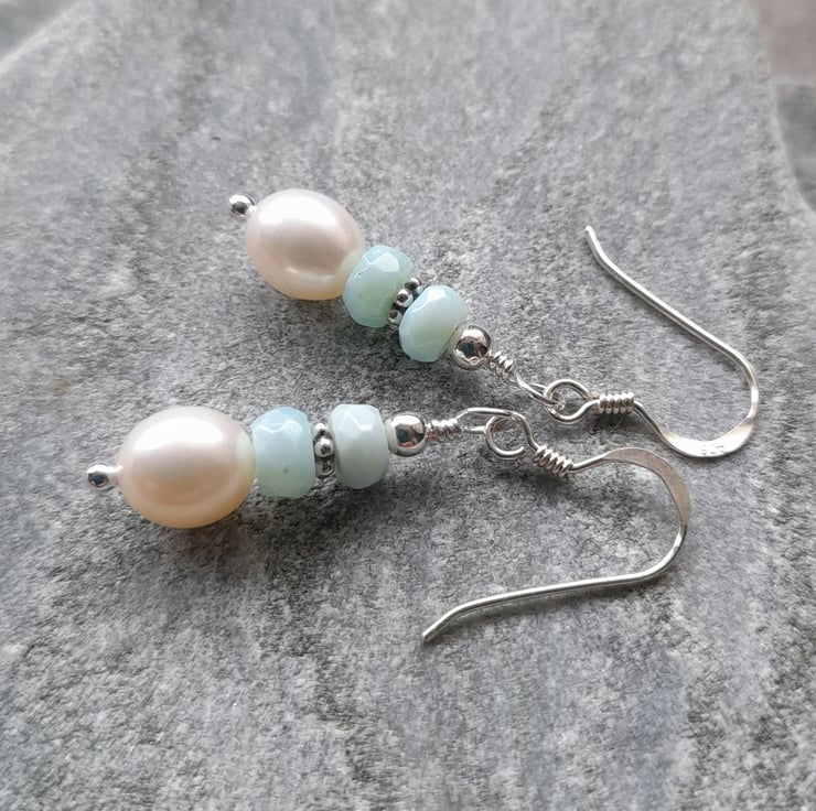 White freshwater cultured pearls with aqua blue coloured opal semi precious gemstones are attached to sterling silver ear wires.